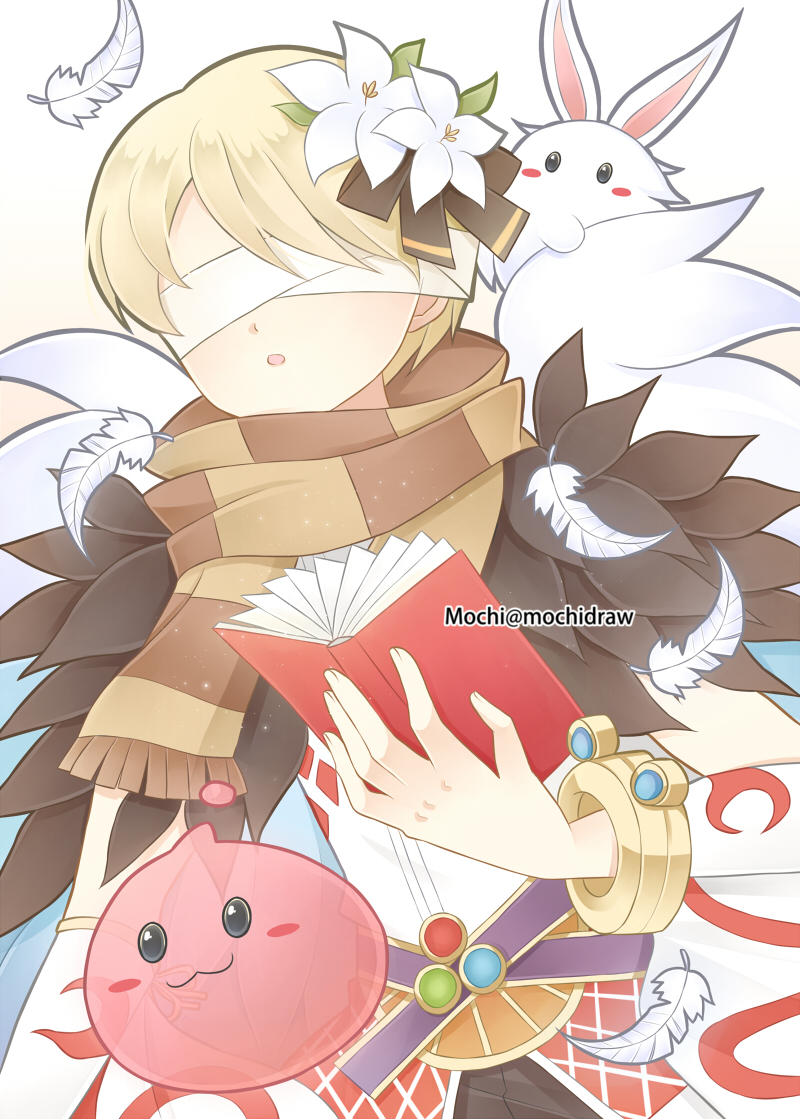 1boy :3 bangle blonde_hair book bow bracelet brown_bow chinese_commentary commentary_request detached_sleeves feathers flower fur_collar hair_bow hair_flower hair_ornament holding holding_book jewelry lunatic_(ragnarok_online) male_focus mochidraw open_mouth poring rabbit ragnarok_online shirt short_hair slime_(creature) sorcerer_(ragnarok_online) upper_body white_flower white_shirt white_sleeves