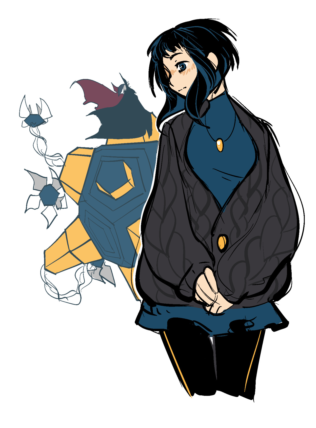 1boy 1girl apocalymon digimon digimon_(creature) highres simple_background skirt white_background