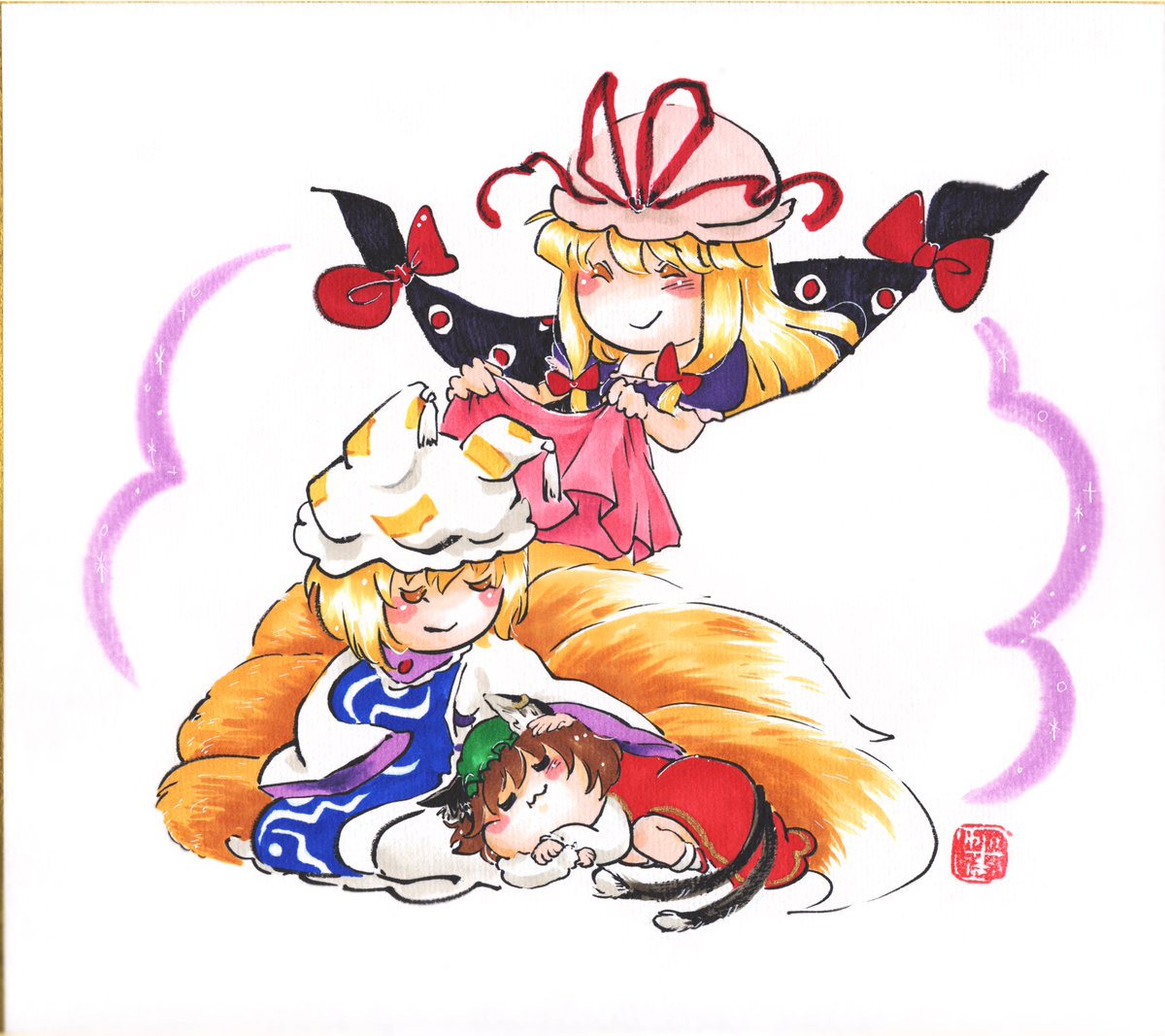 3girls :3 animal_ear_piercing animal_ears animal_hat blanket blonde_hair blush_stickers bow brown_hair cat_ears cat_tail chen closed_eyes covering_with_blanket curled_up dress earrings fox_tail gap_(touhou) green_headwear hair_bow hat hat_ribbon holding holding_blanket jewelry kitsune lap_pillow long_hair long_sleeves mob_cap multiple_girls multiple_tails nekomata perfect_cherry_blossom petting purple_dress ribbon short_hair sidelocks single_earring smile stamp_mark tabard tail touhou two_tails wide_sleeves yakumo_family_(touhou) yakumo_ran yakumo_yukari yuzuha_(yuzutime)