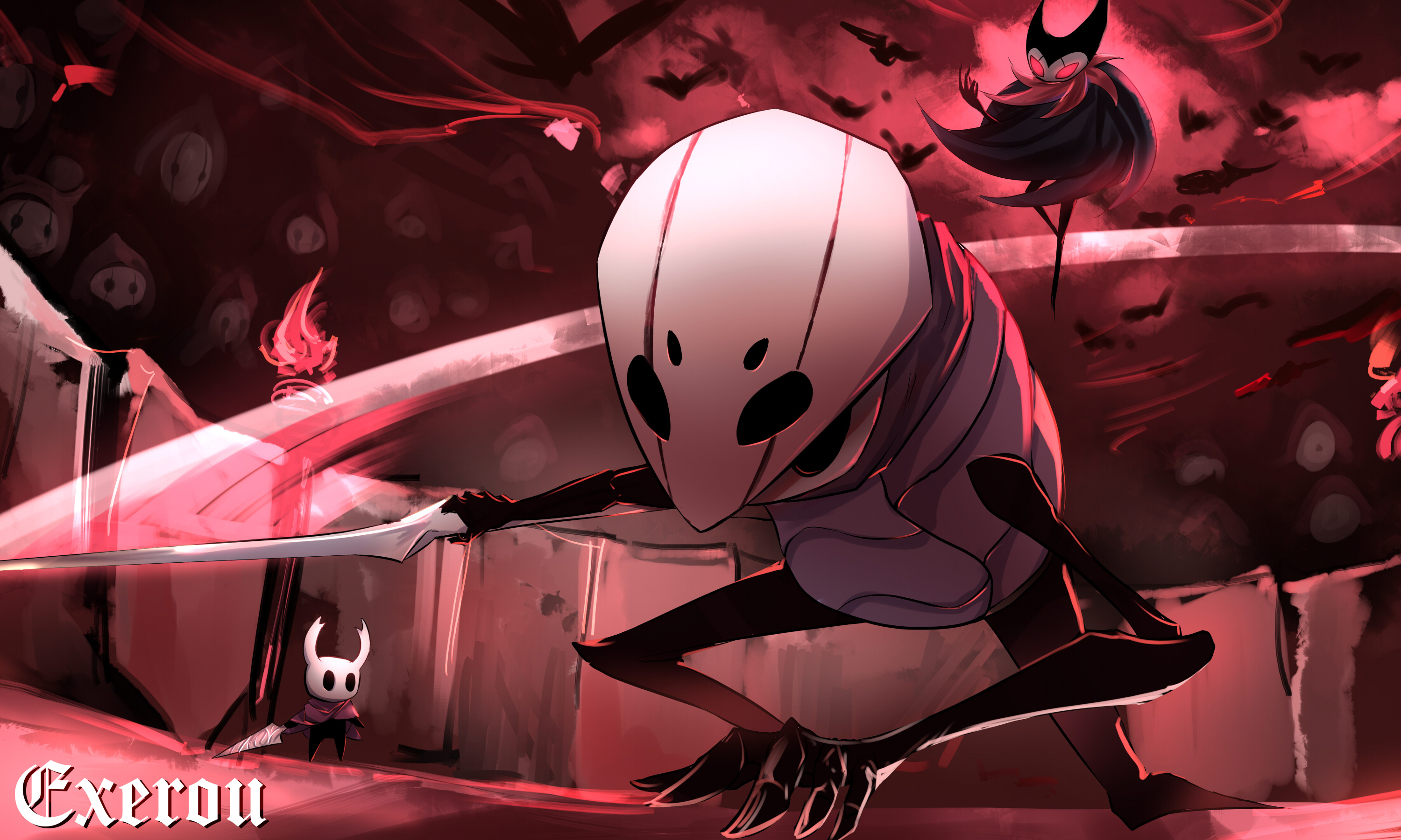 2boys 6+others black_skin bug cloak colored_skin commentary_request fighting fighting_stance grimm_(hollow_knight) grimmkin_master_(hollow_knight) grimmkin_nightmare_(hollow_knight) highres holding holding_sword holding_weapon hollow_eyes hollow_knight knight_(hollow_knight) mask multiple_boys multiple_others nail_(hollow_knight) no_humans outdoors pure_nail_(hollow_knight) quirrel signature sword top-exerou weapon