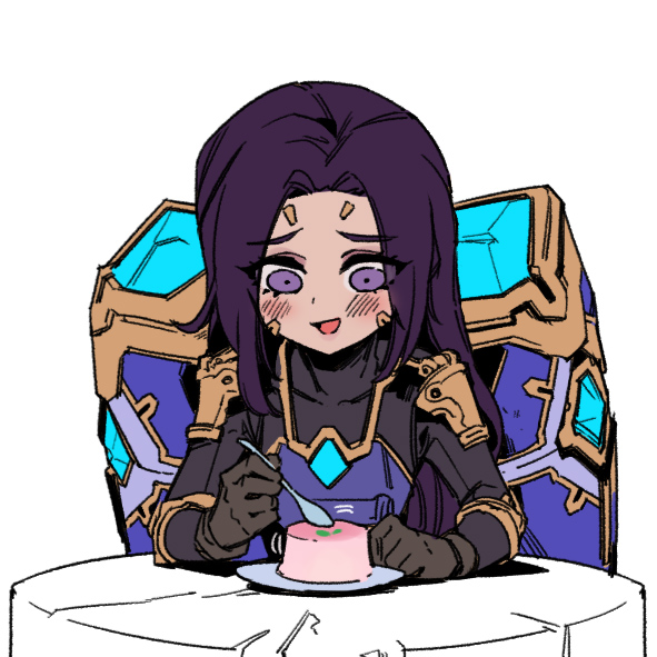 1girl :d alternate_costume blush brown_gloves food gloves kai'sa league_of_legends long_hair long_sleeves open_mouth phantom_cross plate purple_hair simple_background smile solo table white_background