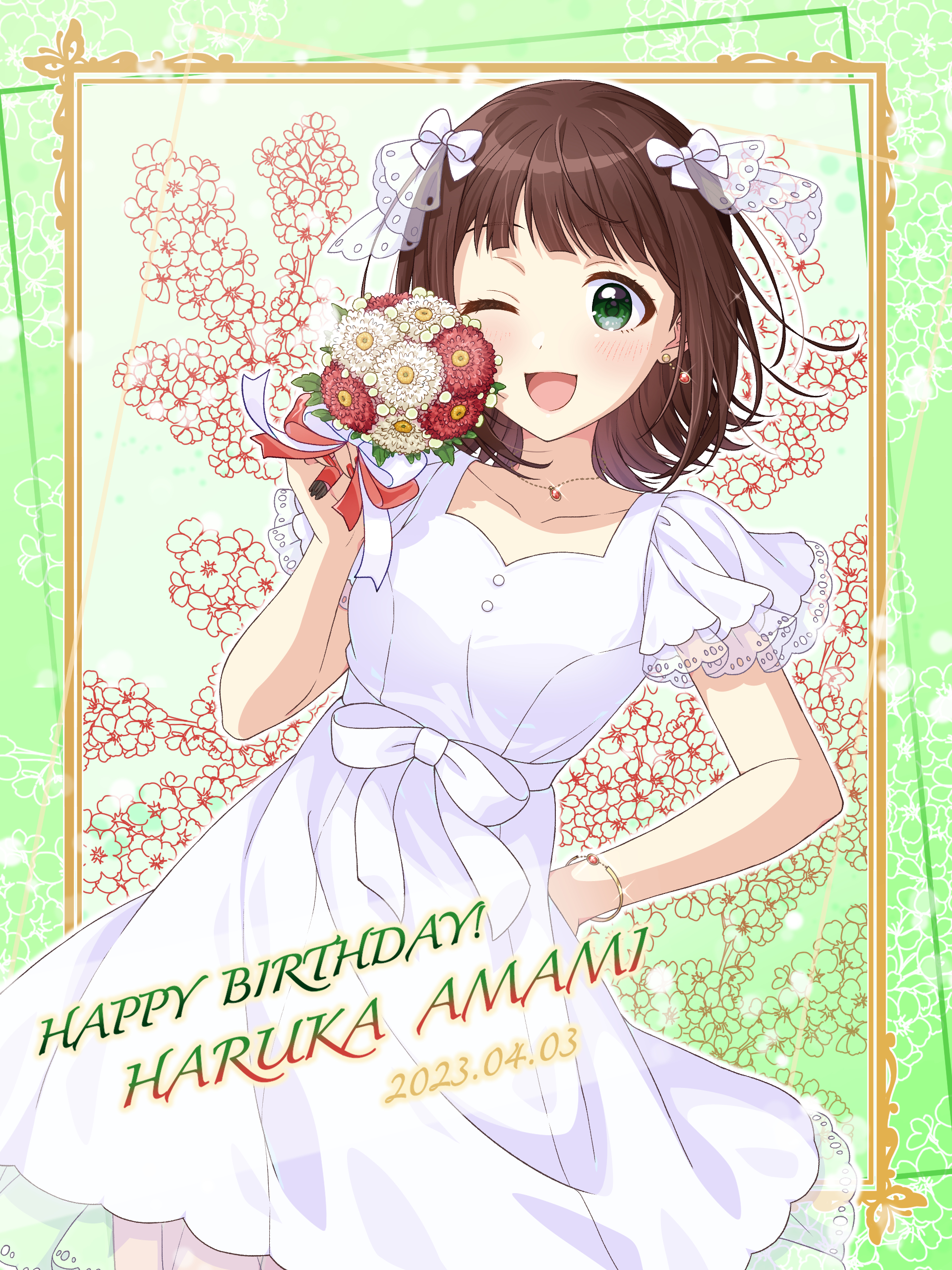 1girl ;d absurdres amami_haruka bouquet bow bracelet brown_hair character_name collarbone daisy_(flower) dress earrings flower framed gem green_eyes hair_bow hand_on_own_hip highres holding holding_bouquet idolmaster idolmaster_(classic) jewelry medium_hair necklace one_eye_closed open_mouth outline red_flower red_gem shiro_(ongrokm) short_sleeves smile solo sparkle standing white_bow white_dress white_flower