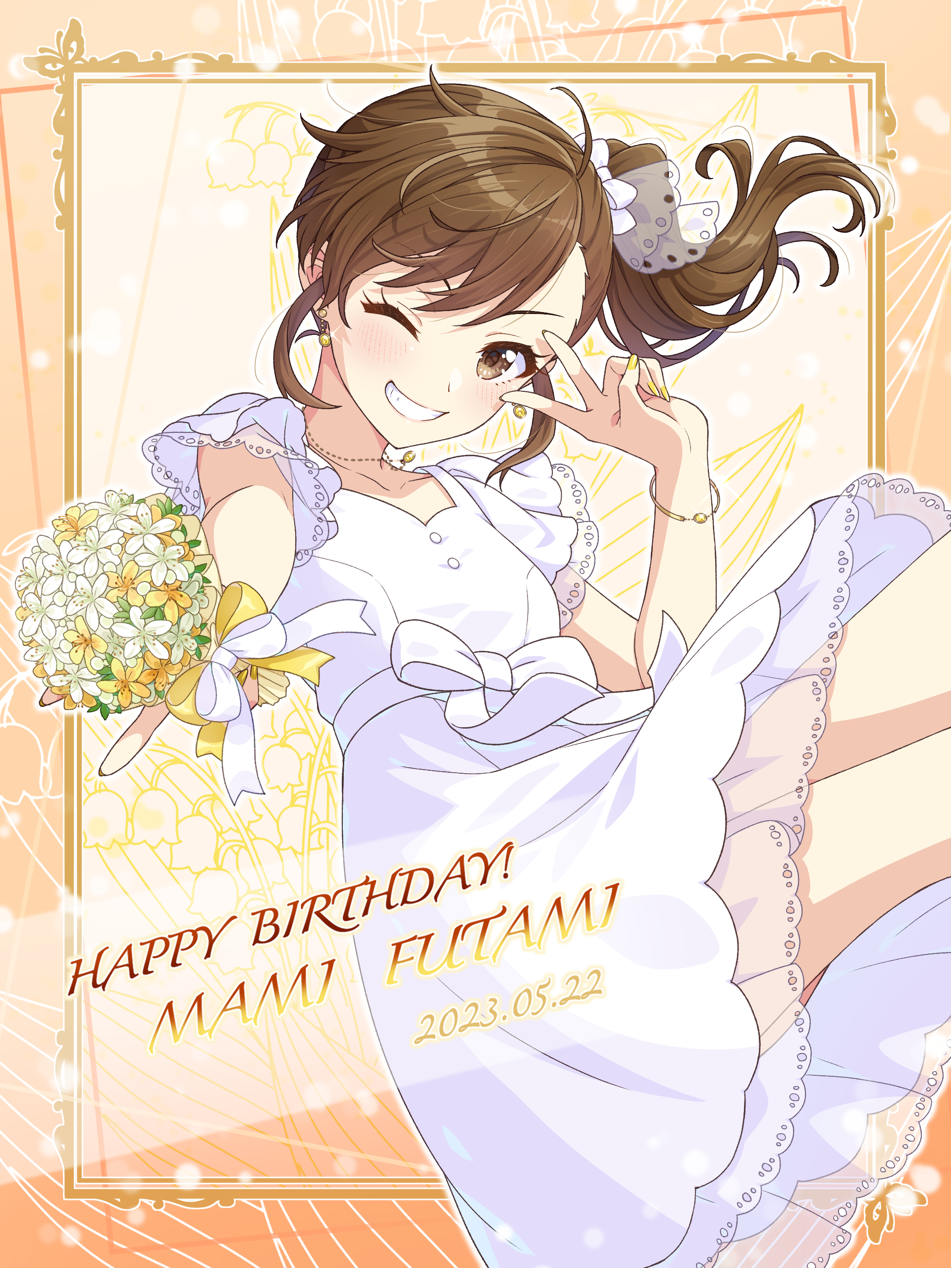 1girl 2023 absurdres border bouquet bow brown_eyes brown_hair character_name collarbone dated dress earrings flower framed futami_mami gem grin hair_bow happy_birthday highres holding holding_bouquet idolmaster idolmaster_(classic) jewelry long_hair looking_at_viewer medium_dress nail_polish necklace one_eye_closed ornate_border ribbon shiro_(ongrokm) short_sleeves side_ponytail smile solo sparkle v v_over_eye white_bow white_dress white_ribbon yellow_gem yellow_nails yellow_ribbon