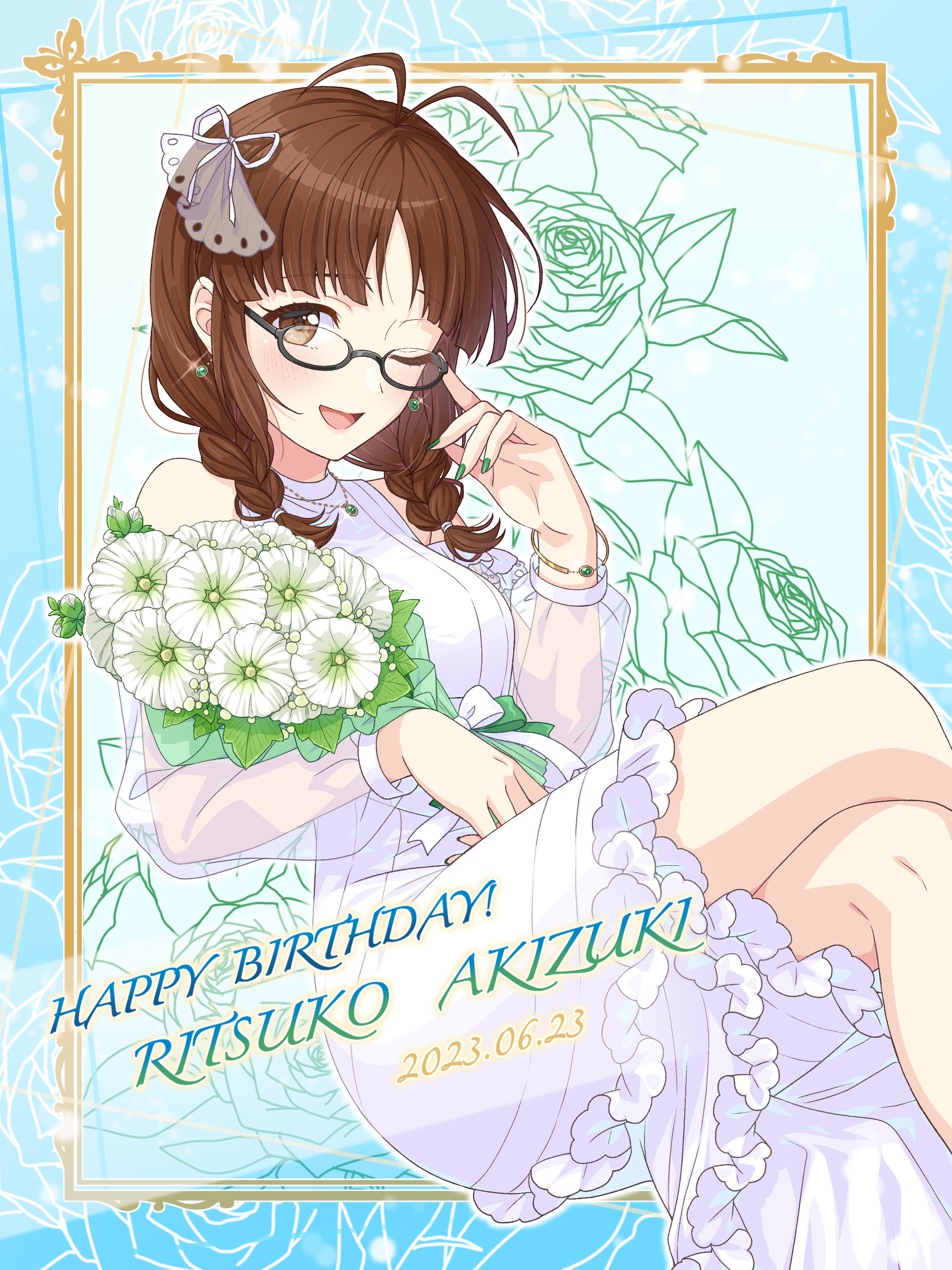 1girl 2023 ;d absurdres adjusting_eyewear akizuki_ritsuko antenna_hair bracelet braid brown_eyes brown_hair character_name crossed_legs dated dress earrings framed gem glasses green_gem green_nails hair_ribbon happy_birthday highres hollyhock idolmaster idolmaster_(classic) invisible_chair jewelry long_hair long_sleeves nail_polish one_eye_closed open_mouth outline ribbon see-through_clothes see-through_sleeves shiro_(ongrokm) short_dress sitting smile solo sparkle twin_braids white_dress white_ribbon