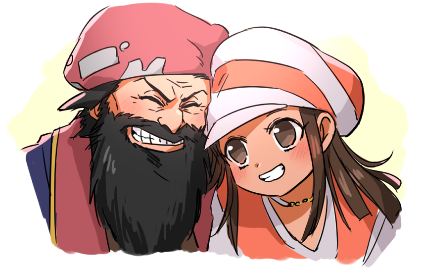 1boy 1girl arc_the_lad arc_the_lad_i beard black_hair brown_eyes brown_hair chongora_(arc_the_lad) clenched_teeth closed_eyes facial_hair large_hat long_hair over_wassyoi simple_background smile teeth white_background