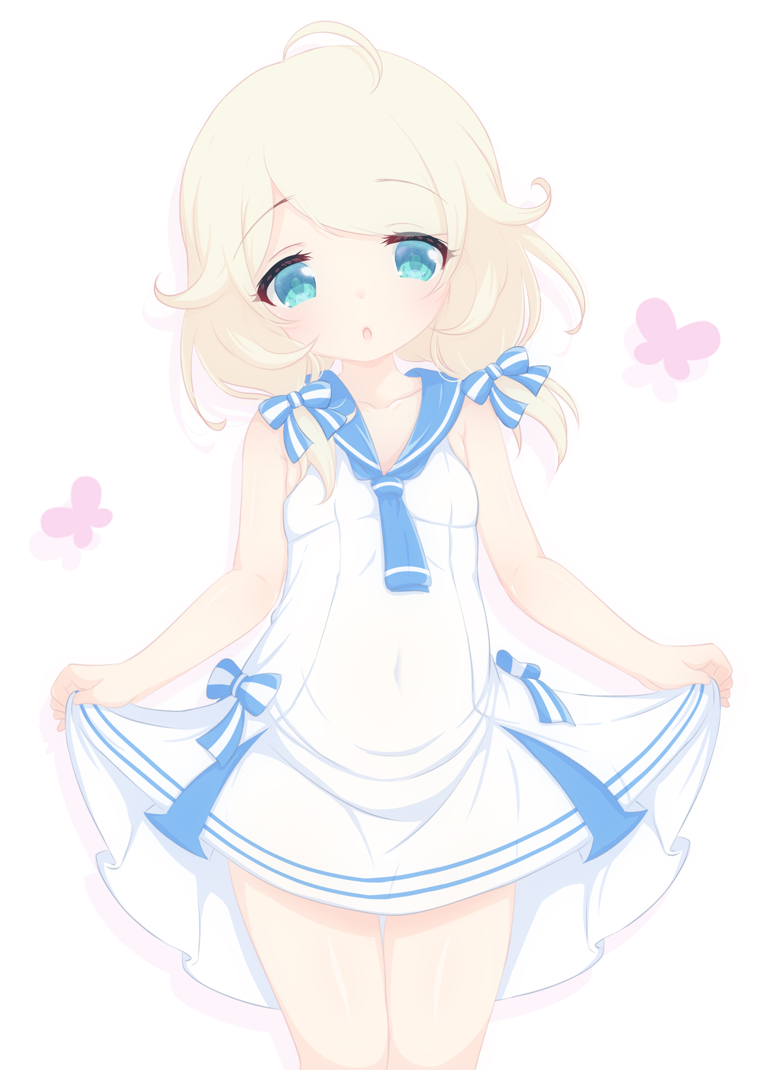 1girl ahoge animal_print belly blonde_hair blue_bow blue_neckerchief blue_sailor_collar bow breasts butterfly_print chestnut_mouth child collarbone commentary_request covered_navel dot_nose green_eyes hair_bow highres holding_own_dress hosizora_mikoto idolmaster idolmaster_cinderella_girls light_blush looking_at_viewer low_twintails medium_hair messy_hair neckerchief open_mouth sailor_collar sailor_swimsuit_(idolmaster) small_breasts solo thighs twintails white_background white_swimsuit yusa_kozue