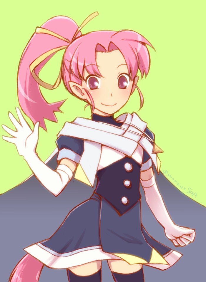 1girl black_thighhighs cape closed_mouth dress gloves hair_ornament hair_ribbon long_hair looking_at_viewer millie_chliette natsuki_megumi pink_eyes pink_hair pointy_ears ponytail ribbon simple_background skirt smile solo star_ocean star_ocean:_first_departure tail thighhighs white_gloves