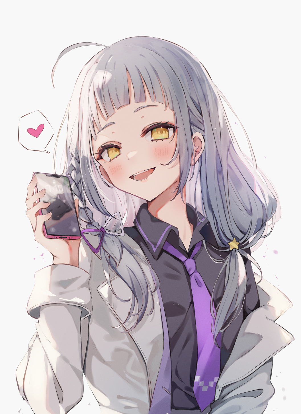 1girl grey_hair highres hololive looking_at_viewer miakiuehashi murasaki_shion necktie open_clothes open_mouth open_shirt purple_necktie solo virtual_youtuber yellow_eyes