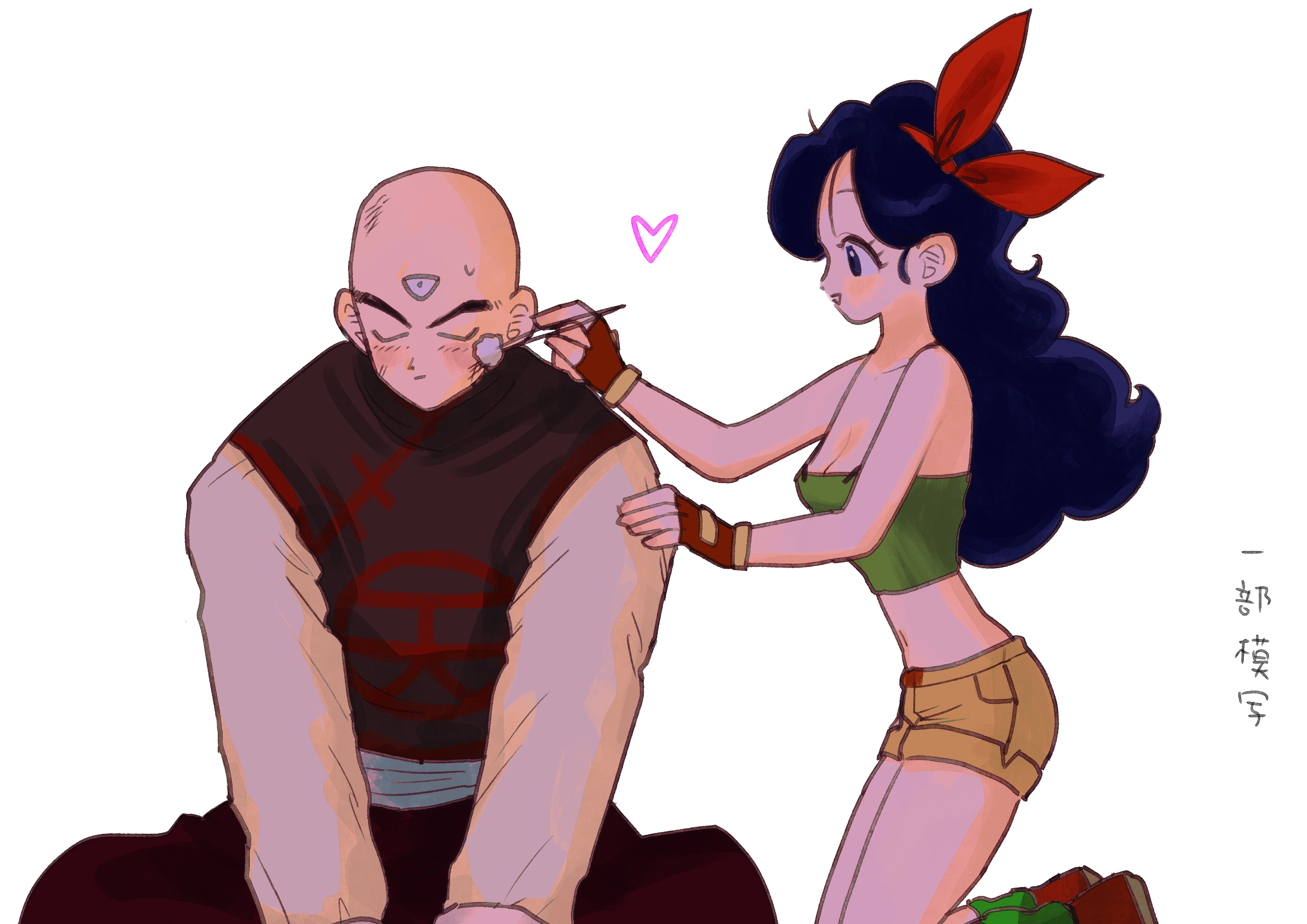 absurdres after_battle blush couple dragon_ball dragon_ball_super embarrassed heart highres lunch_(dragon_ball) lunch_(good)_(dragon_ball) nervous nervous_sweating scratches super_dragon_ball_heroes sweat sweatdrop tagme tenshinhan