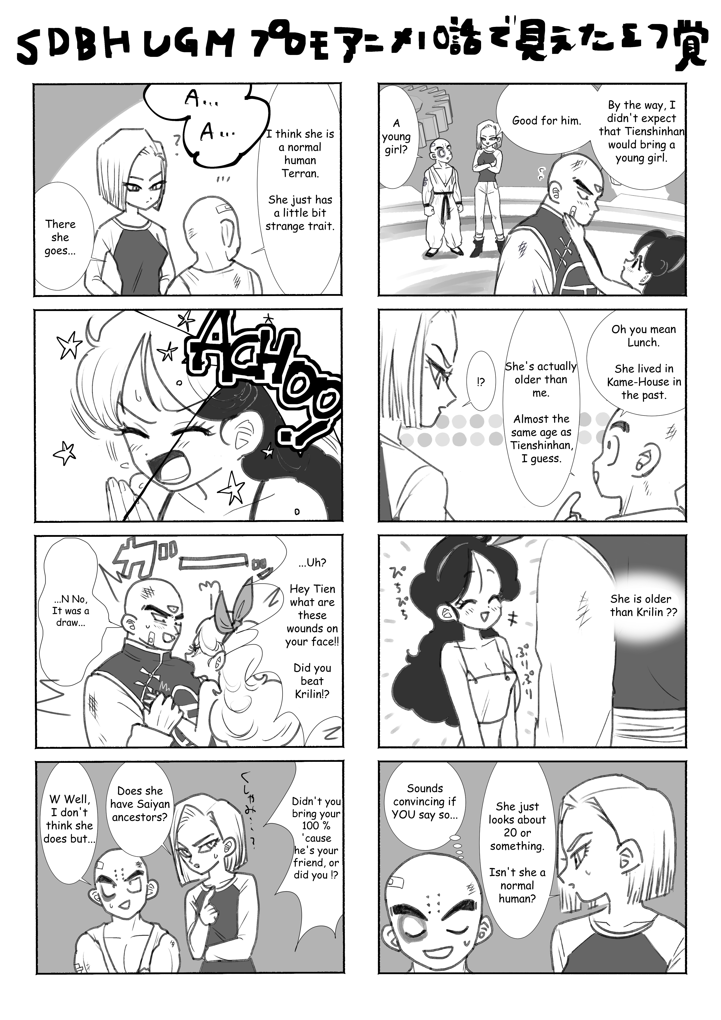 absurdres after_battle android_18 couple dragon_ball dragon_ball_super english_text highres husband_and_wife kuririn lunch_(bad)_(dragon_ball) lunch_(dragon_ball) lunch_(good)_(dragon_ball) monochrome scratches sneezing speech_bubble super_dragon_ball_heroes tagme tenshinhan