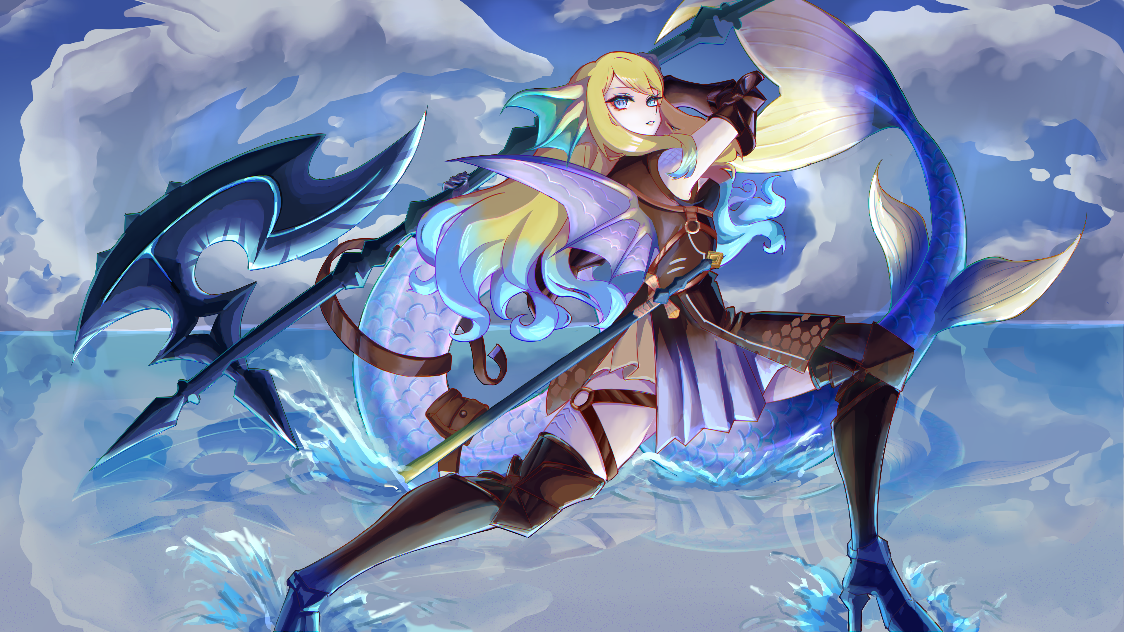 1girl absurdres blonde_hair blue_eyes blue_hair commission commissioner_upload dragon_girl dragon_tail gloves gradient_hair highres holding indie_virtual_youtuber lernaean_viper long_hair looking_at_viewer multicolored_hair non-web_source open_mouth solo tail thighhighs virtual_youtuber weapon zeta_(vtuber)