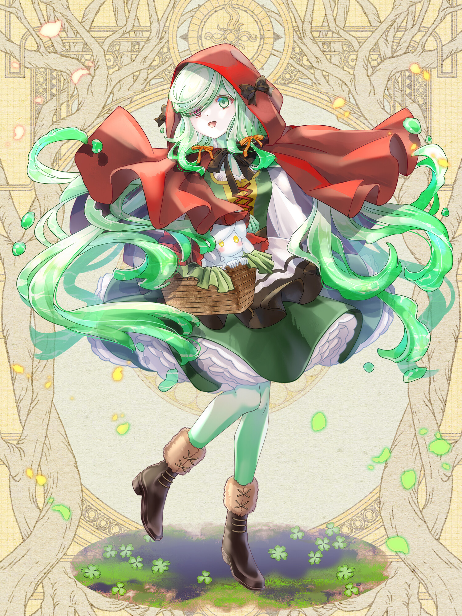 1girl 1other :d basket black_bow bow brown_footwear cape colored_skin cross-laced_clothes dairoku_ryouhei dress full_body ghost green_dress green_hair green_skin hair_over_one_eye heterochromia highres hood hooded_cape leaf long_hair long_sleeves open_mouth orange_ribbon pale_skin pepper_tone rai-gg red_eyes ribbon smile standing very_long_hair yellow_background