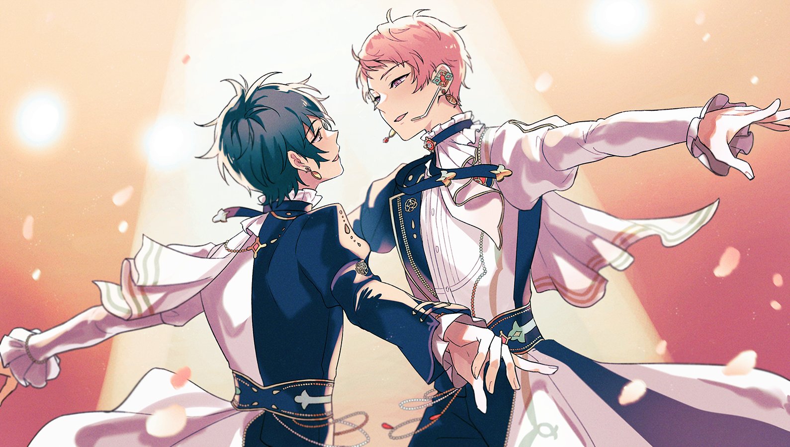 2boys black_hair earrings ensemble_stars! facing_to_the_side headset idol_clothes itsuki_shu jewelry kagehira_mika le_temps_des_fleurs_(ensemble_stars!) looking_at_another male_focus multiple_boys official_alternate_costume open_mouth pink_hair purple_eyes round_o0 short_bangs short_hair smile stage_lights yellow_eyes