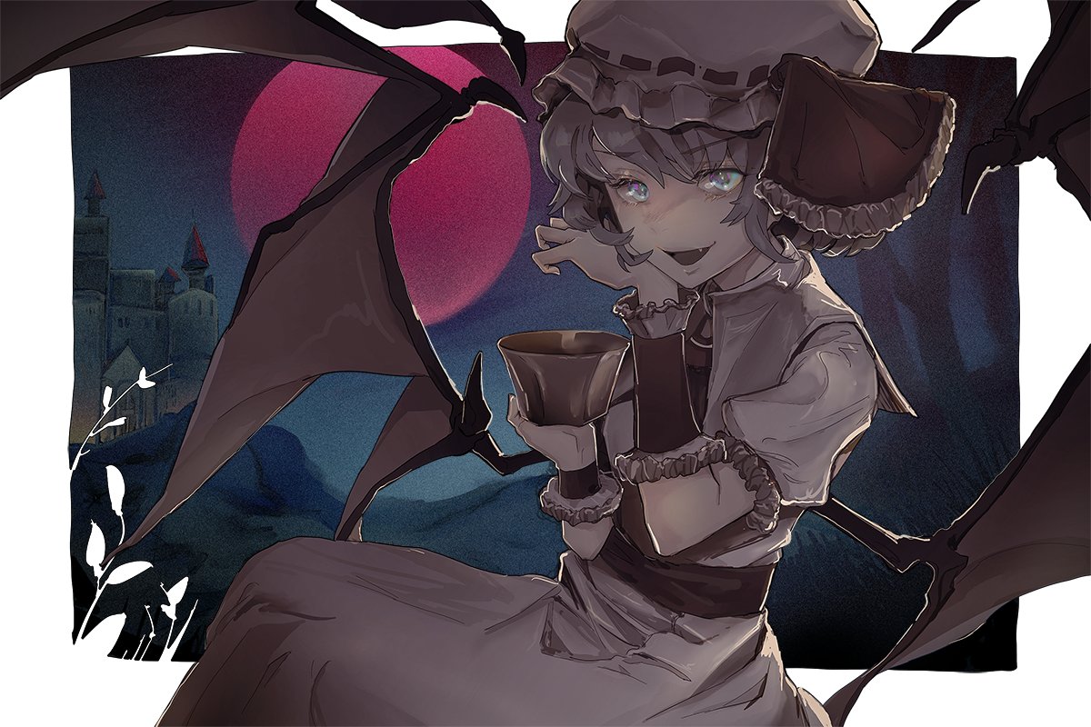 1girl armband ascot bat_wings black_gem blue_eyes blue_hair border collared_shirt commentary_request commission cup eyelashes fang frilled_armband frilled_hat frilled_ribbon frilled_sleeves frills full_moon gem grass hand_on_own_cheek hand_on_own_face hat hat_ribbon holding holding_cup layered_shirt looking_at_viewer mob_cap moon night open_mouth outdoors outside_border puffy_short_sleeves puffy_sleeves ranko_no_ane red_armband red_ascot red_moon red_ribbon red_sash remilia_scarlet ribbon ribbon-trimmed_headwear ribbon_trim sash scarlet_devil_mansion shirt short_hair short_sleeves sitting skeb_commission skirt skirt_set sky smile sprout teacup touhou tree white_border white_headwear white_shirt white_skirt wings