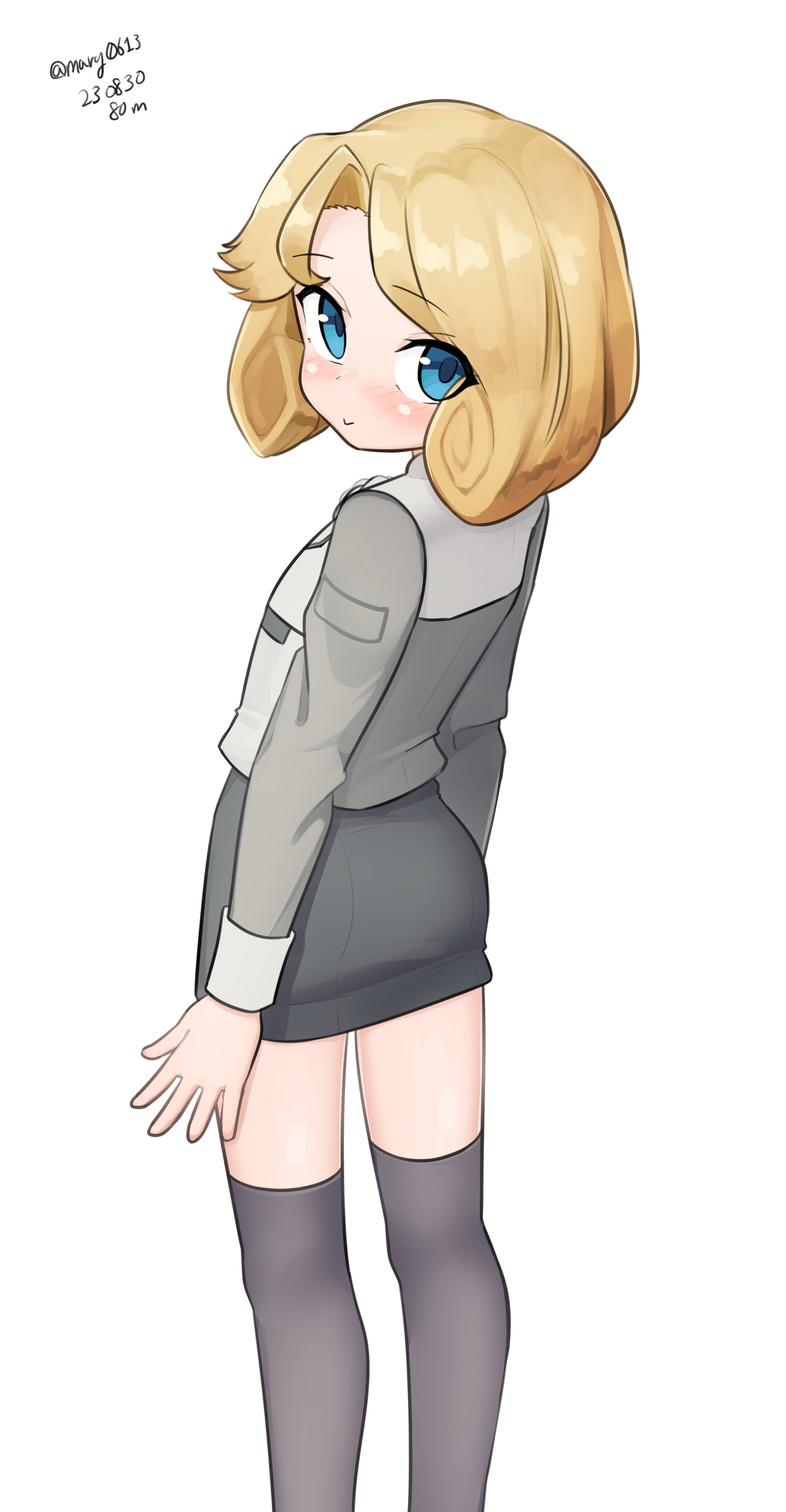 absurdres blonde_hair blue_eyes cosplay dated feet_out_of_frame from_behind grey_shirt grey_skirt grey_thighhighs highres janus_(kancolle) kantai_collection looking_at_viewer looking_back maru_(marg0613) military_uniform nelson_(kancolle) nelson_(kancolle)_(cosplay) one-hour_drawing_challenge parted_bangs pencil_skirt shirt short_hair simple_background skirt thighhighs twitter_username white_background