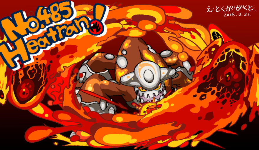 2016 blue_background character_name dated gen_4_pokemon heatran lava legendary_pokemon looking_at_viewer nintendo no_humans numbered open_mouth pokemon pokemon_(creature) red_background red_eyes solo tokunogawa translation_request