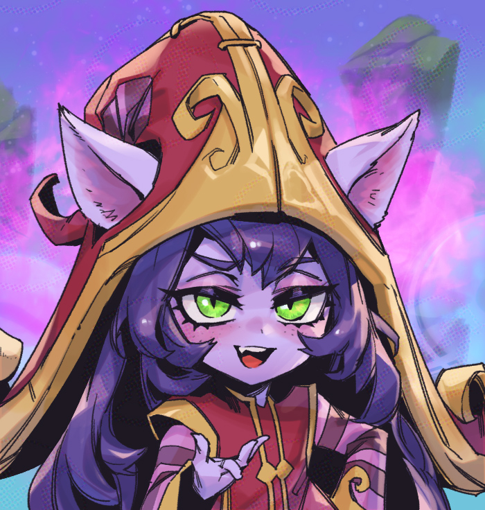 1girl :d dress ears_through_headwear fang green_eyes hair_between_eyes league_of_legends lulu_(league_of_legends) open_mouth outdoors phantom_cross pointy_ears purple_hair red_dress red_headwear slit_pupils smile solo striped_sleeves teeth tongue upper_body upper_teeth_only