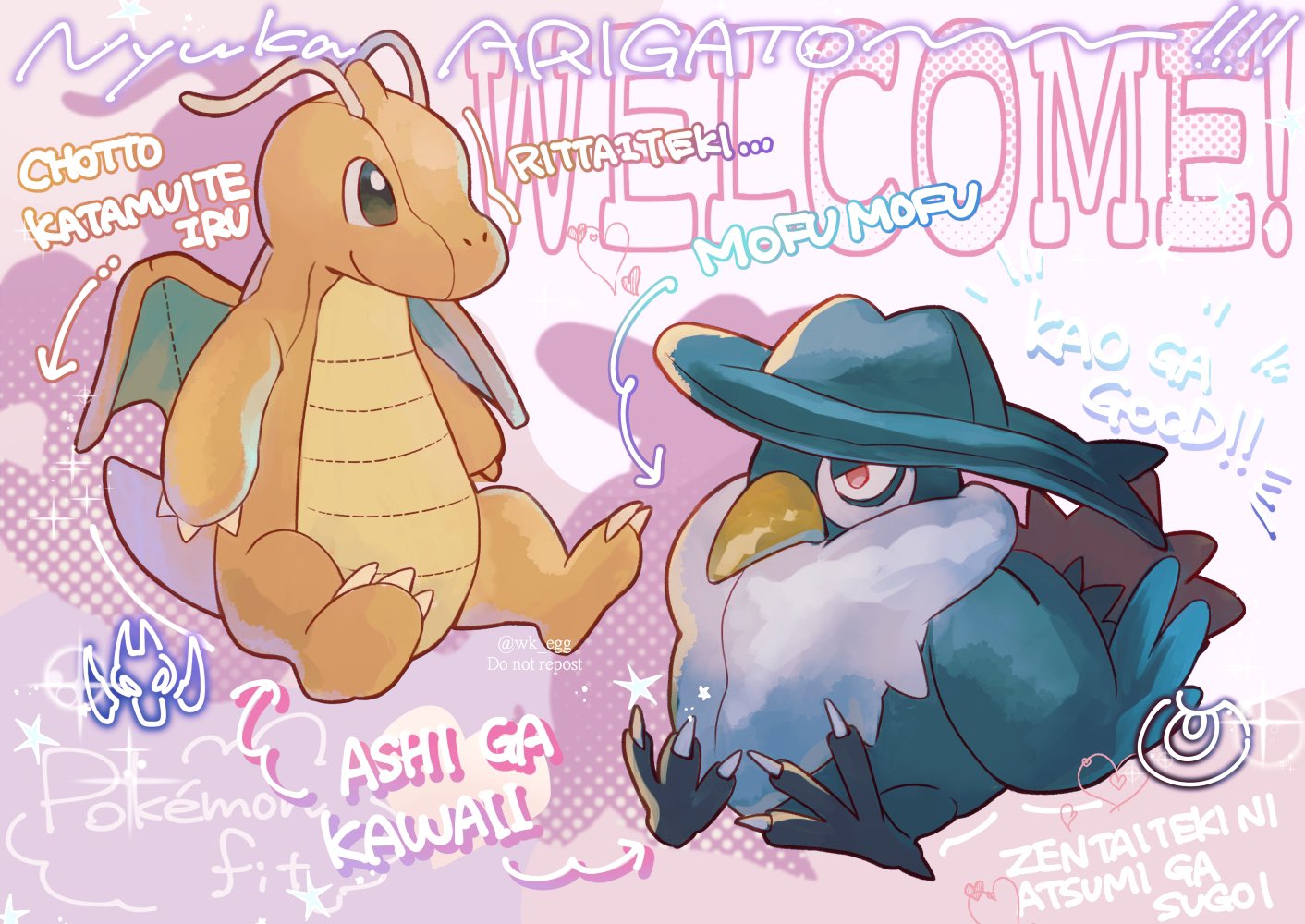 arrow_(symbol) character_doll commentary_request copyright_name doll dragonite eko_(wk_egg) gen_1_pokemon gen_4_pokemon heart honchkrow nintendo no_humans pokemon sparkle still_life stitches stuffed_toy translation_request twitter_username watermark