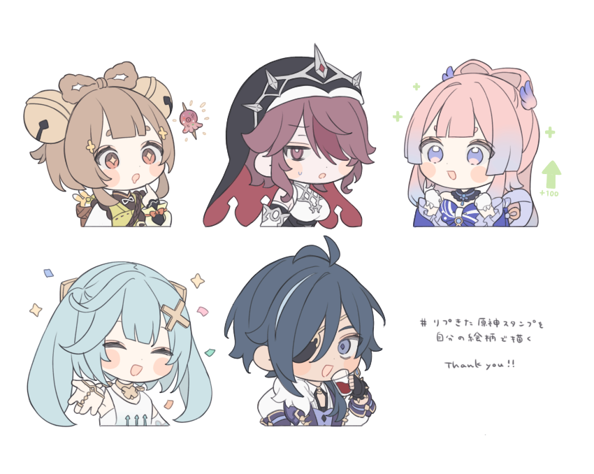 1boy 4girls arrow_(symbol) bell black_headwear blue_hair blush bow-shaped_hair breasts brown_hair chibi clenched_hands closed_eyes confetti cup detached_sleeves eyepatch faruzan_(genshin_impact) genshin_impact hoyolab_sticker_redraw gloves habit hair_bell hair_between_eyes hair_ornament hair_over_one_eye holding holding_cup kaeya_(genshin_impact) long_hair medium_breasts multicolored_hair multiple_girls nun_headdress open_mouth pink_eyes purinacow rosaria_(genshin_impact) sangonomiya_kokomi simple_background small_breasts streaked_hair sweat white_background white_gloves x_hair_ornament yaoyao_(genshin_impact)