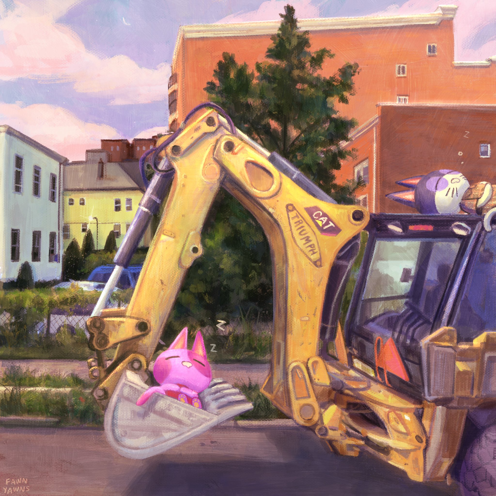 animal_crossing artist_name blue_sky bob_(animal_crossing) building cat closed_eyes cloud day excavator fawn_(fawnyawns) grass highres lying nintendo on_back open_mouth outdoors punchy_(animal_crossing) road scenery sidewalk sky sleeping tree zzz