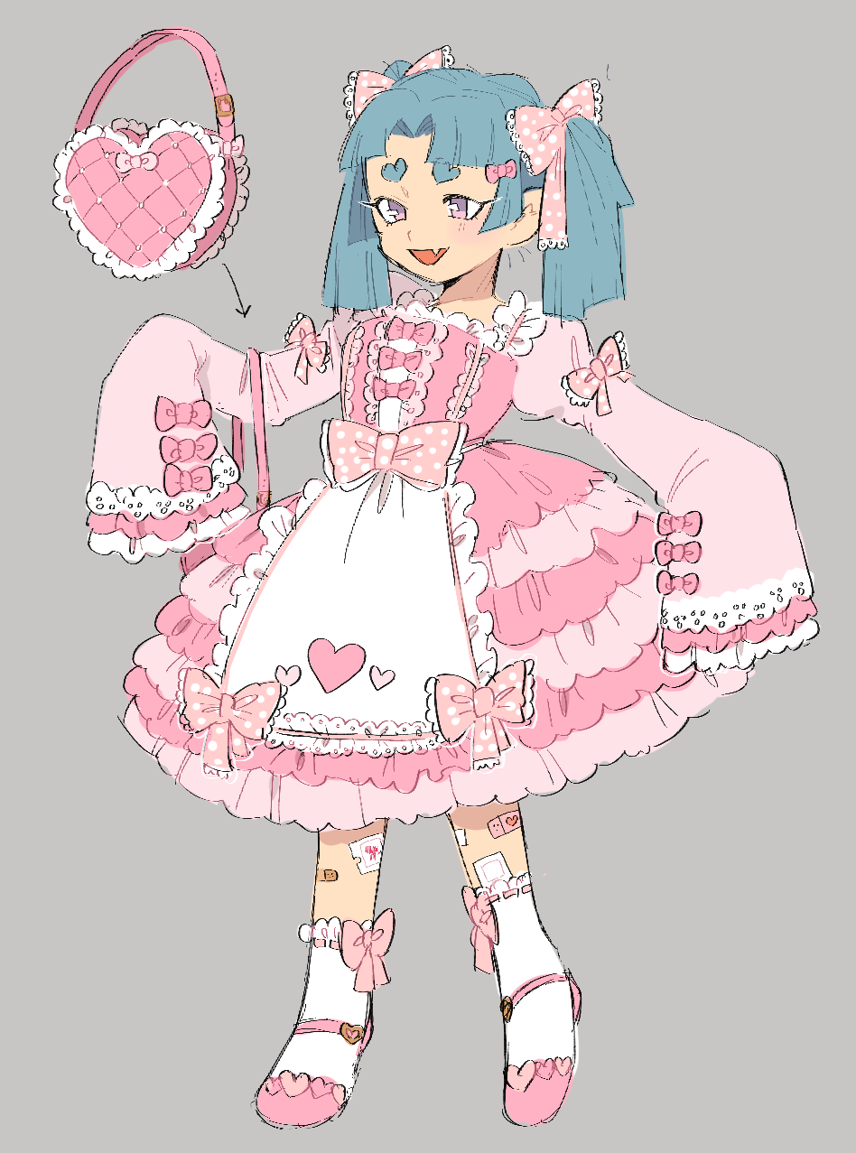 1girl accurate_lolita_coord alternate_costume bandaid bandaid_on_leg blue_hair blunt_bangs blunt_ends bow fang full_body grey_background hair_ribbon heart-shaped_bag heart-shaped_eyebrows highres hime_lolita juliet_sleeves liar_liar_(tokimekiwaku) lolita_fashion long_hair long_sleeves minamida_yukari open_mouth parted_bangs polka_dot polka_dot_bow puffy_sleeves purple_eyes ribbon ribbon-trimmed_socks ribbon_trim skin_fang sleeve_bow sleeves_past_wrists smile socks solo sweet_lolita thick_eyebrows tokimekiwaku twintails