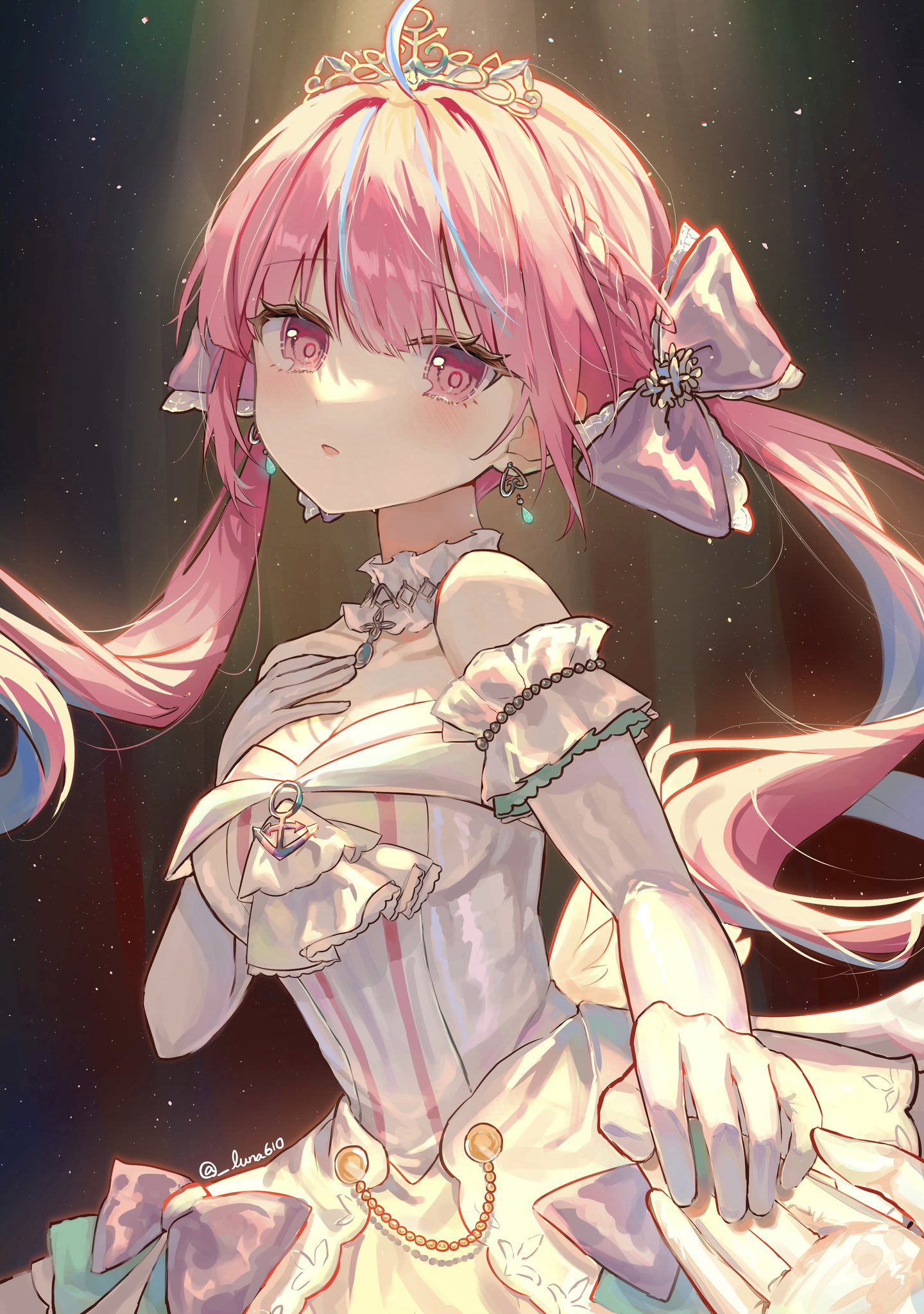 1girl 1other ahoge bare_shoulders blue_hair blush bow braid breasts cleavage colored_inner_hair dress earrings elbow_gloves frills gloves hair_bow hand_on_own_chest highres holding_hands hololive jewelry light_particles long_hair looking_at_viewer luna_(luna610) medium_breasts minato_aqua minato_aqua_(aqua_iro_super_dream) multicolored_hair parted_lips pink_eyes pink_hair pov solo_focus strapless strapless_dress streaked_hair tiara twintails twitter_username two-tone_hair virtual_youtuber white_dress white_gloves