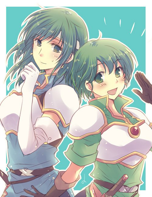2girls :d armor breastplate bridal_gauntlets fire_emblem fire_emblem:_thracia_776 green_eyes green_hair harushino karin_(fire_emblem) looking_at_viewer misha_(fire_emblem) multiple_girls nintendo open_mouth pauldrons short_hair shoulder_armor smile waving white_bridal_gauntlets