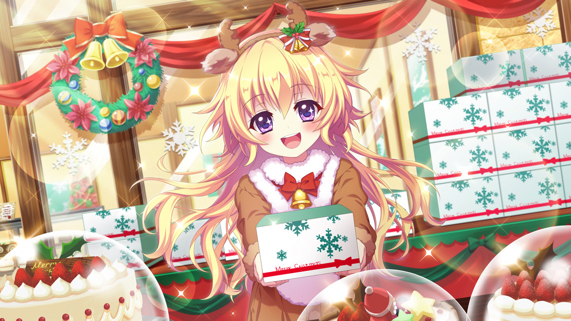1girl animal_costume antlers bell blonde_hair blush bow bowtie brick_wall cake christmas_wreath dot_nose dutch_angle figure film_grain food game_cg hasegawa_mii hat horns incoming_gift izumi_tsubasu lens_flare long_hair long_sleeves looking_at_viewer merry_christmas non-web_source official_art open_mouth painting_(object) purple_eyes re:stage! red_bow red_bowtie reindeer_antlers reindeer_costume santa_hat self-datamine smile snowflake_print solo sparkle sparkling_eyes star_(symbol) straight-on strawberry_cake teeth upper_teeth_only window wooden_beam wreath