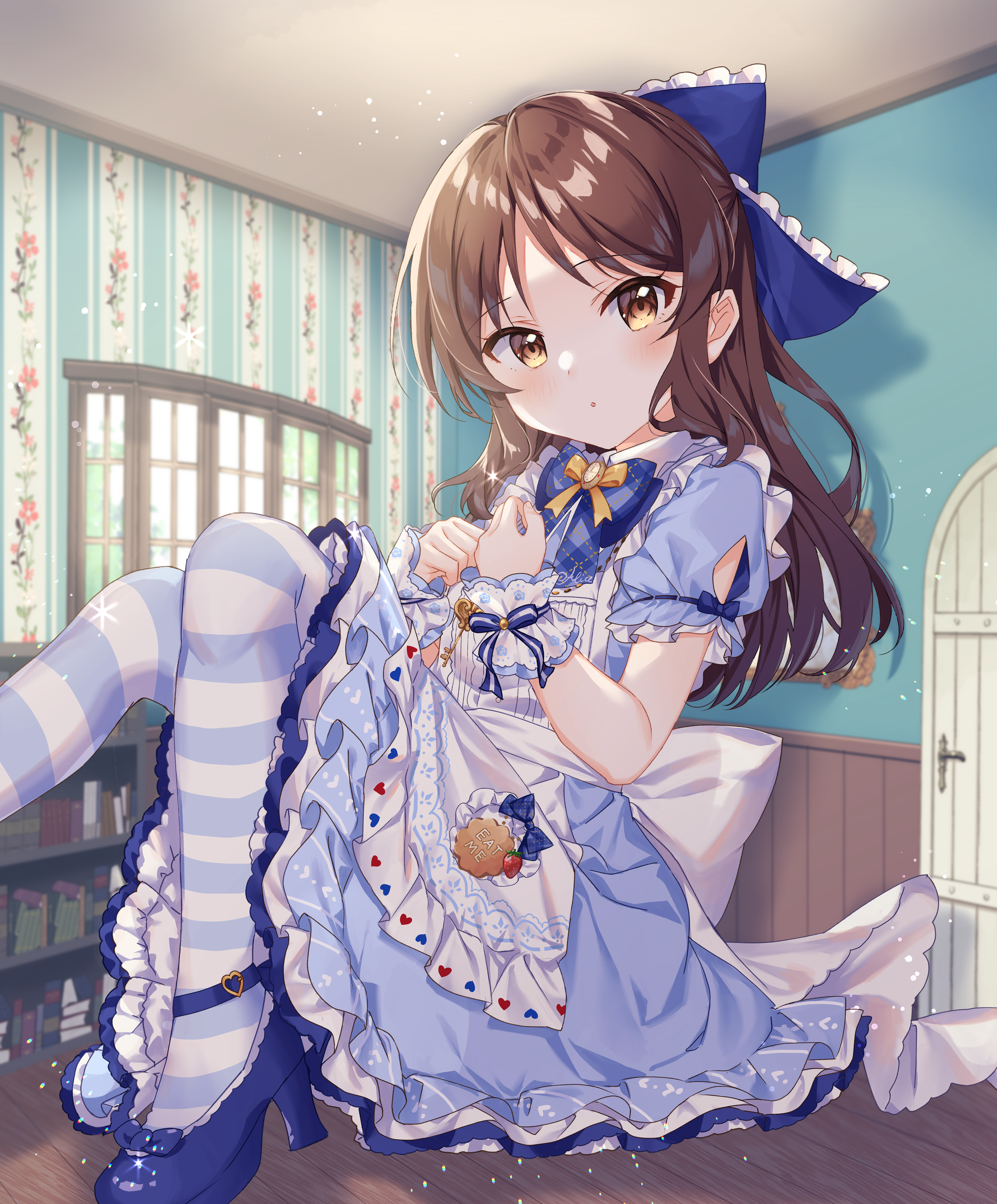 1girl absurdres alice_(alice_in_wonderland) alice_(alice_in_wonderland)_(cosplay) apron blue_bow blue_dress blue_footwear bow breasts brown_eyes brown_hair commentary_request commission cosplay dress flat_chest hair_bow high_heels highres idolmaster idolmaster_cinderella_girls indoors long_hair looking_at_viewer miyakoto pixiv_commission sitting small_breasts solo striped_clothes striped_thighhighs tachibana_arisu thighhighs white_apron wristband