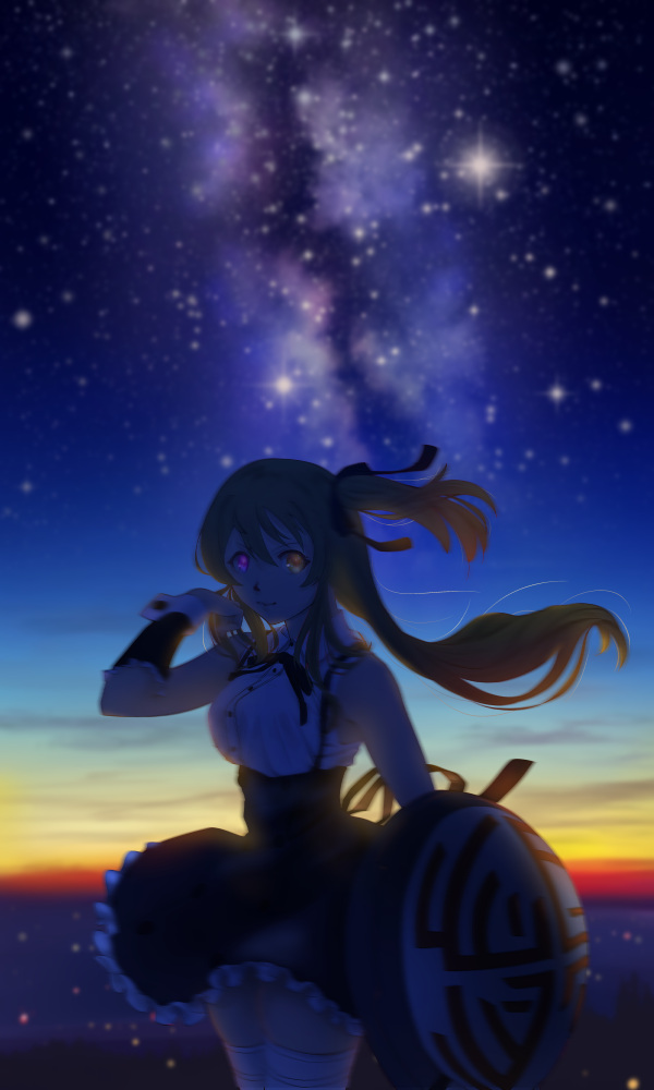 1girl arm_at_side assault_lily bare_shoulders black_ribbon black_skirt breasts brown_hair collared_shirt commentary_request cowboy_shot detached_sleeves floating_hair frilled_sleeves frills hair_between_eyes hair_ribbon hand_up heterochromia high-waist_skirt holding holding_shield horizon kuo_shenlin light_particles long_hair looking_at_viewer medium_breasts milky_way miniskirt neck_ribbon nenshuu5man night one_side_up outdoors pink_eyes ribbon school_uniform shield shirt short_sleeves sidelocks skirt sky sleeveless sleeveless_shirt smile solo standing star_(sky) star_(symbol) starry_sky suspender_skirt suspenders thighhighs white_shirt white_thighhighs yellow_eyes yurigaoka_girls_academy_school_uniform