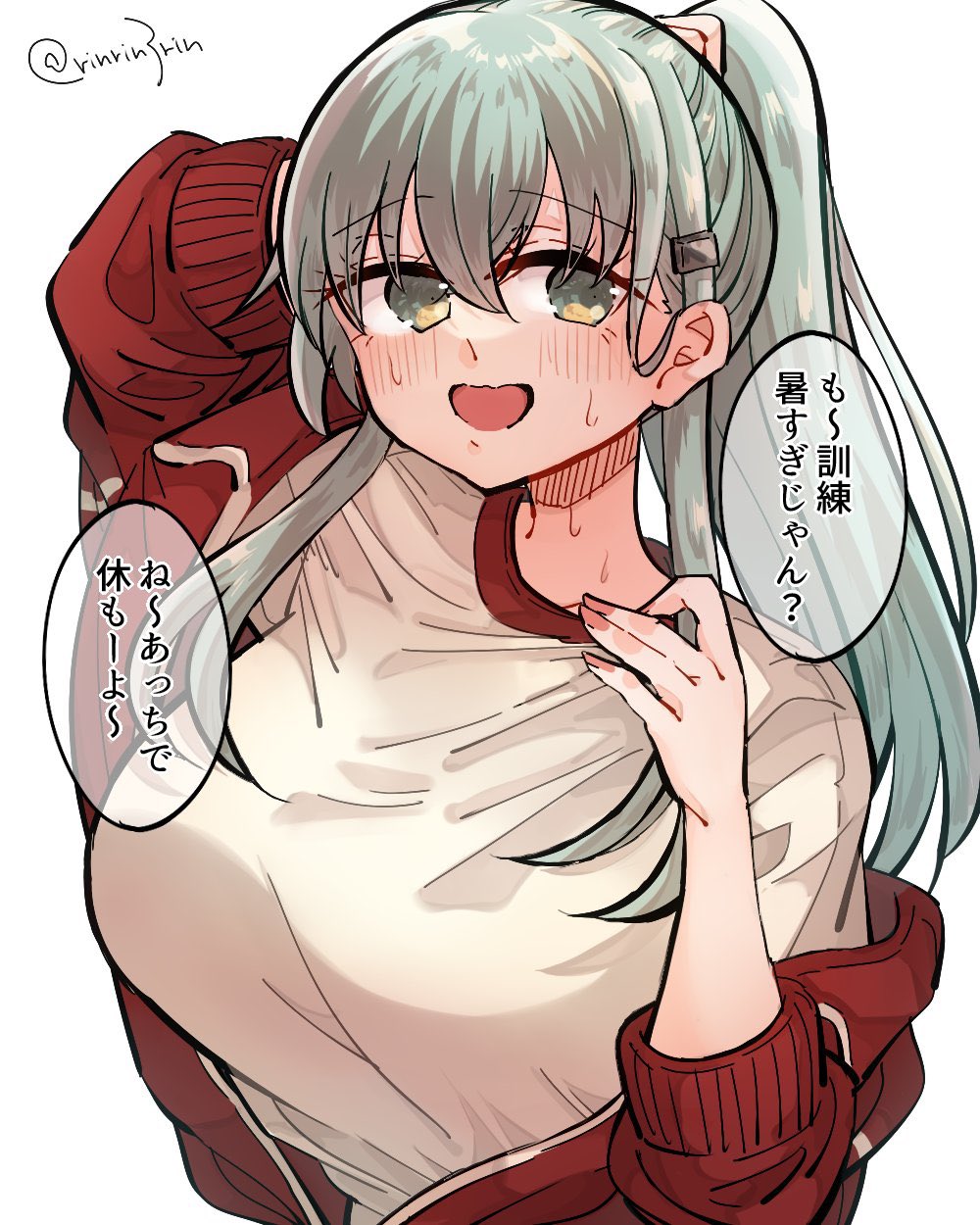 1girl alternate_costume alternate_hairstyle aqua_eyes aqua_hair blush breasts gym_shirt gym_uniform hair_between_eyes hair_ornament hairclip highres jacket kantai_collection large_breasts long_hair long_sleeves looking_at_viewer matsunaga_(haku) open_clothes open_jacket open_mouth ponytail red_jacket shirt simple_background smile solo speech_bubble suzuya_(kancolle) sweatdrop track_jacket twitter_username upper_body white_background