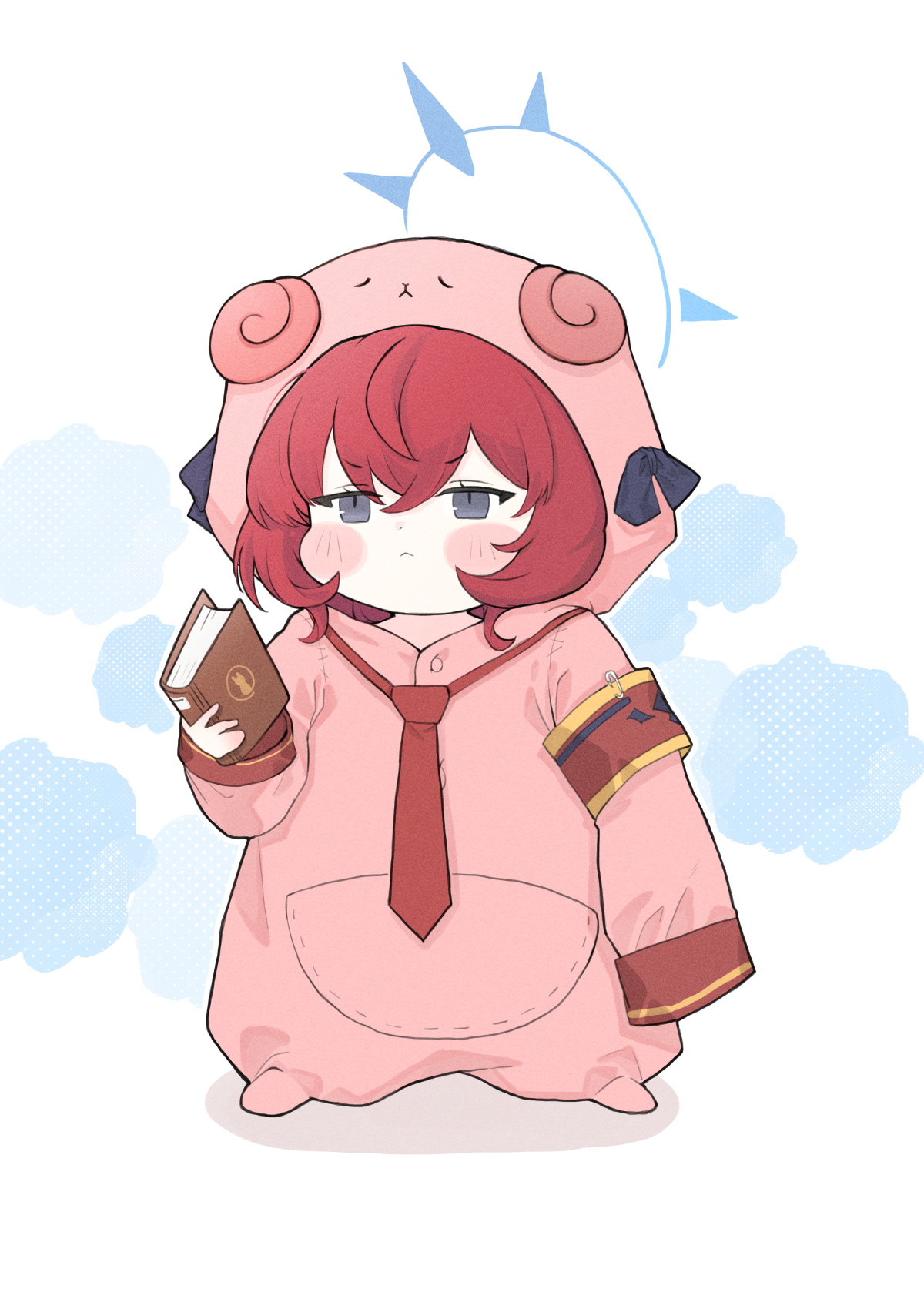 1girl :< alternate_costume animal_costume armband black_eyes black_necktie blue_archive book bow commentary_request full_body hair_between_eyes halo highres holding holding_book iroha_(blue_archive) long_hair long_sleeves looking_at_viewer necktie red_armband red_bow safety_pin sheep_costume sidelocks simple_background sleepwear solo standing two-tone_background wavy_hair yosik