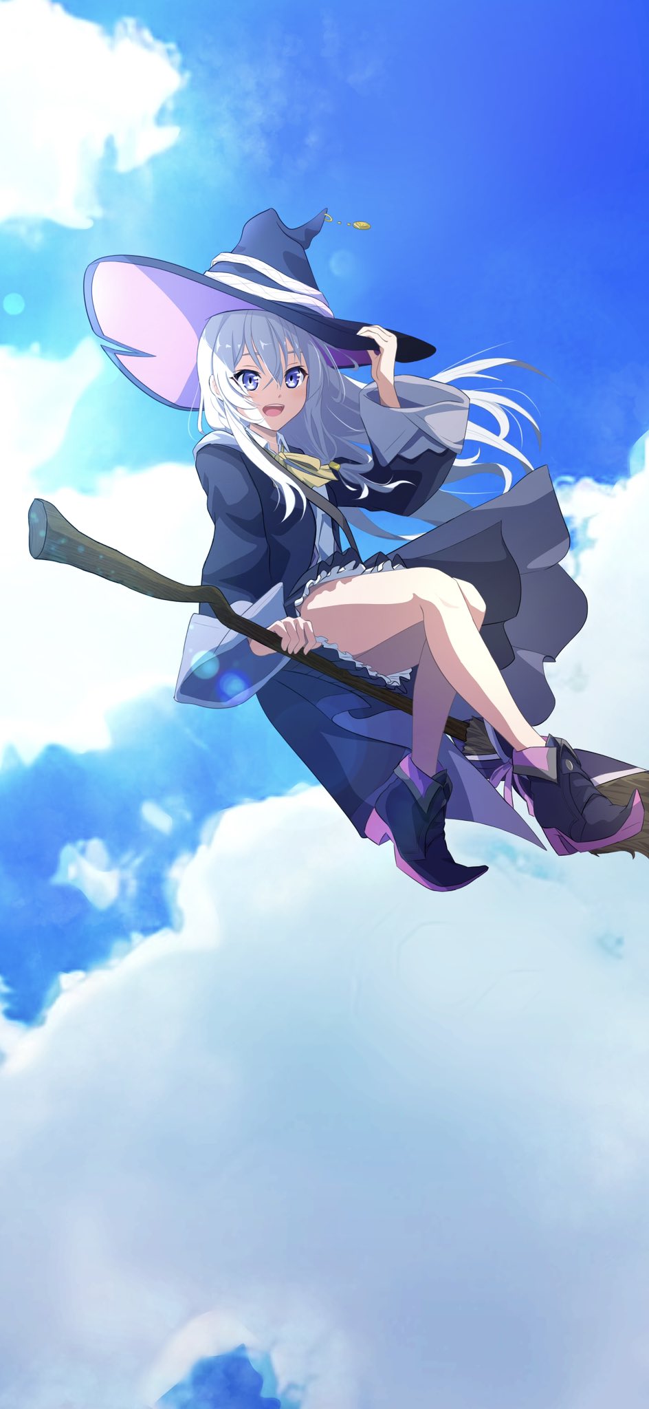 1girl black_hat black_robe blue_sky bow bowtie broom broom_riding cloud cloudy_sky collared_shirt cover_image elaina_(majo_no_tabitabi) flying hat highres hooded_robe long_hair long_sleeves looking_at_viewer majo_no_tabitabi na-suke open_clothes open_mouth open_robe pointy_boots ribbon robe shirt sidesaddle sky smile solo white_shirt witch witch_hat yellow_bow yellow_bowtie yellow_ribbon