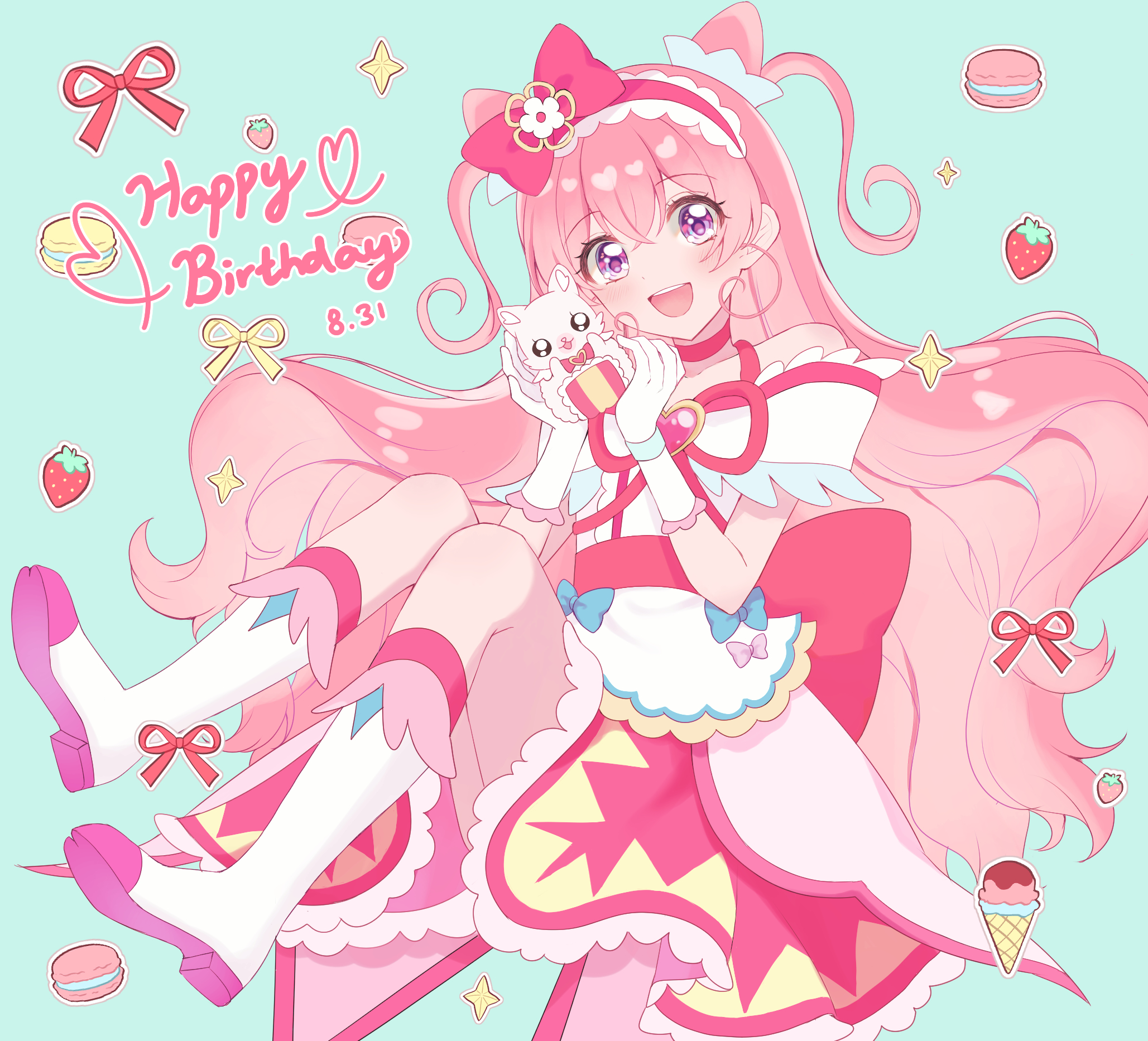 :d animal apron back_bow birthday boots bow brooch choker commentary cone_hair_bun cure_precious cursive dated delicious_party_precure double_bun dress english_text floating food fox fruit gloves hair_bow hair_bun hairband happy_birthday heart heart_brooch highres hiru_(user_dzge7447) holding holding_animal jewelry kome-kome large_bow long_hair macaron magical_girl medium_dress nagomi_yui off-shoulder_dress off_shoulder open_mouth pink_hair precure purple_eyes red_bow red_choker red_hairband red_ribbon ribbon smile star_(symbol) strawberry very_long_hair waist_apron white_boots white_dress white_gloves