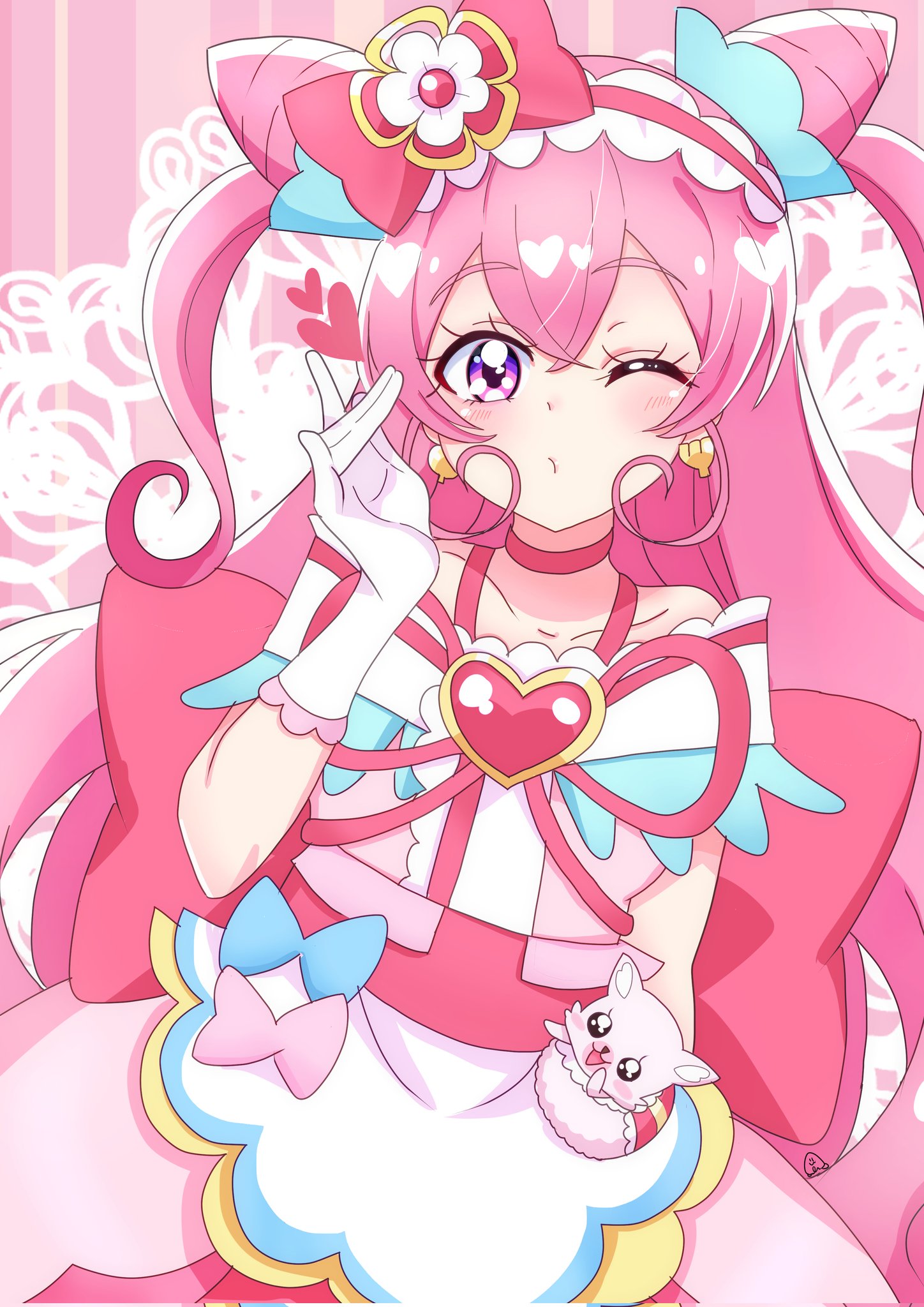 1girl apron arm_behind_head artist_name back_bow blowing_kiss bow choker cone_hair_bun cure_precious delicious_party_precure doily double_bun dress earrings fox gloves hair_bow hair_bun highres jewelry kome-kome large_bow long_hair looking_at_viewer magical_girl momotarouooi nagomi_yui off-shoulder_dress off_shoulder one_eye_closed pink_dress pink_hair precure puckered_lips purple_eyes red_bow red_choker red_ribbon ribbon signature solo standing very_long_hair waist_apron white_gloves