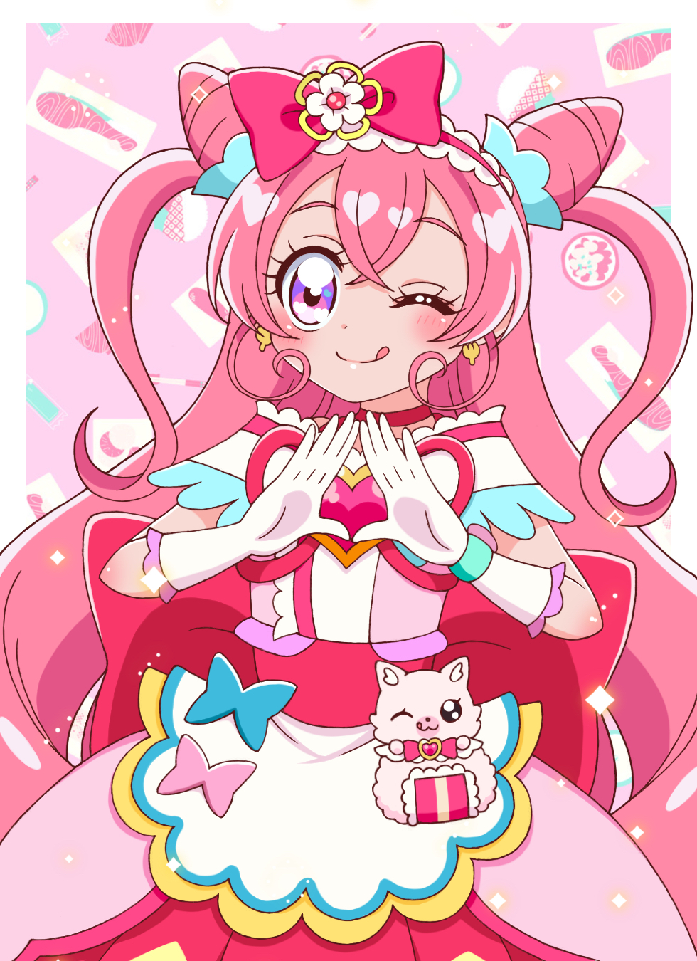 1girl :q apron back_bow bow brooch choker closed_mouth commentary cone_hair_bun cure_precious delicious_party_precure double_bun dress earrings fox gloves hair_bow hair_bun hairband heart heart_brooch highres jewelry kome-kome kuromitsu_(963kuromi) large_bow light_particles long_hair looking_at_viewer magical_girl nagomi_yui off-shoulder_dress off_shoulder own_hands_together pink_dress pink_hair precure purple_eyes red_bow red_choker red_hairband red_ribbon ribbon smile solo standing tongue tongue_out very_long_hair waist_apron white_gloves
