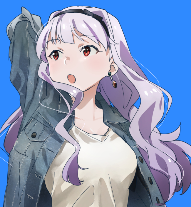 1girl arm_behind_head black_hairband blue_background blue_jacket blush breasts cleavage collarbone earrings grey_hair hairband idolmaster idolmaster_(classic) idolmaster_million_live! idolmaster_million_live!_theater_days jacket jewelry large_breasts long_hair long_sleeves looking_at_another open_clothes open_jacket open_mouth purple_eyes shijou_takane shirop_imas shirt simple_background solo upper_body white_shirt