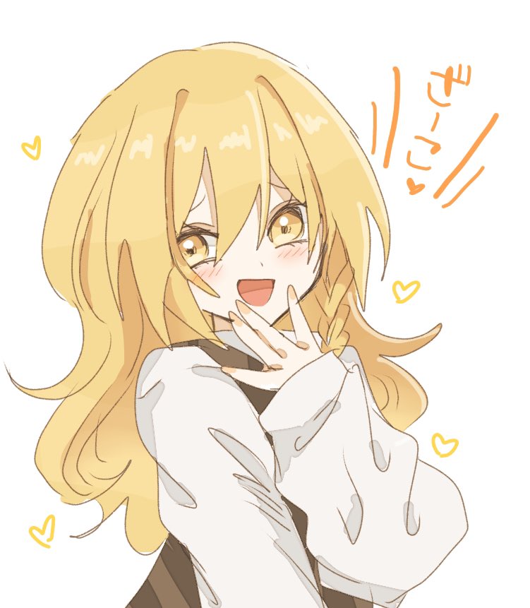 1girl black_vest blonde_hair blush braid fuwafurin hand_on_own_face heart kirisame_marisa long_hair long_sleeves looking_at_viewer missing_headwear shirt simple_background single_braid smile touhou translated turtleneck vest white_shirt yellow_eyes