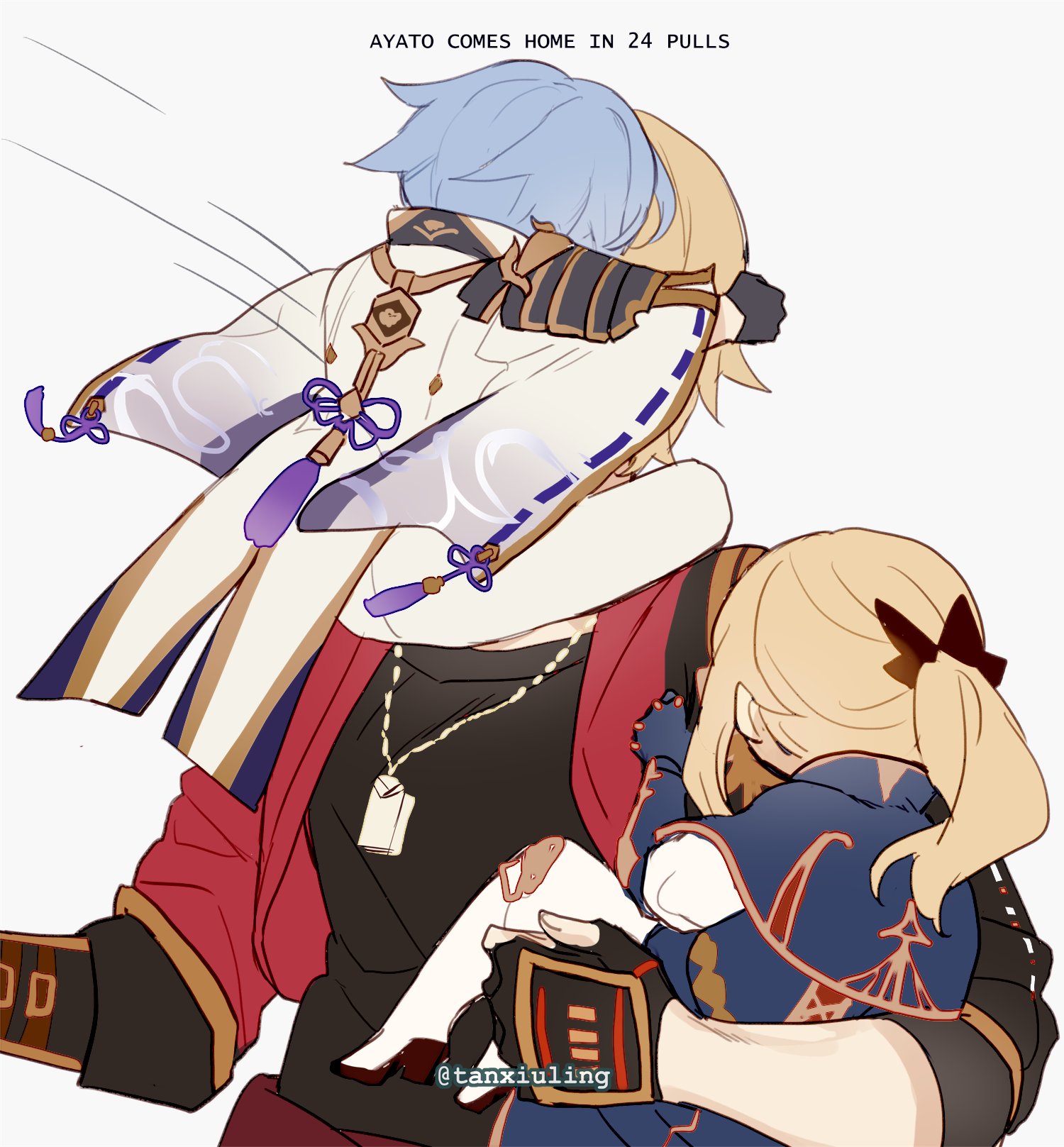 1girl 2boys aged_down armor arms_up artist_name back black_bow black_gloves black_shirt blonde_hair blue_cape blue_gloves blue_hair boots bow cape carrying carrying_person child coat commentary elbow_gloves english_commentary english_text fingernails genshin_impact gloves grey_gloves hair_bow hand_up hands_up highres jacket jean_(genshin_impact) jewelry kamisato_ayato kumashige long_hair long_sleeves looking_at_another multiple_boys necklace open_clothes open_jacket pants ponytail red_jacket shirt short_hair shoulder_armor sidelocks simple_background sitting standing t-shirt thoma_(genshin_impact) white_background white_coat white_footwear white_pants white_shirt wide_sleeves