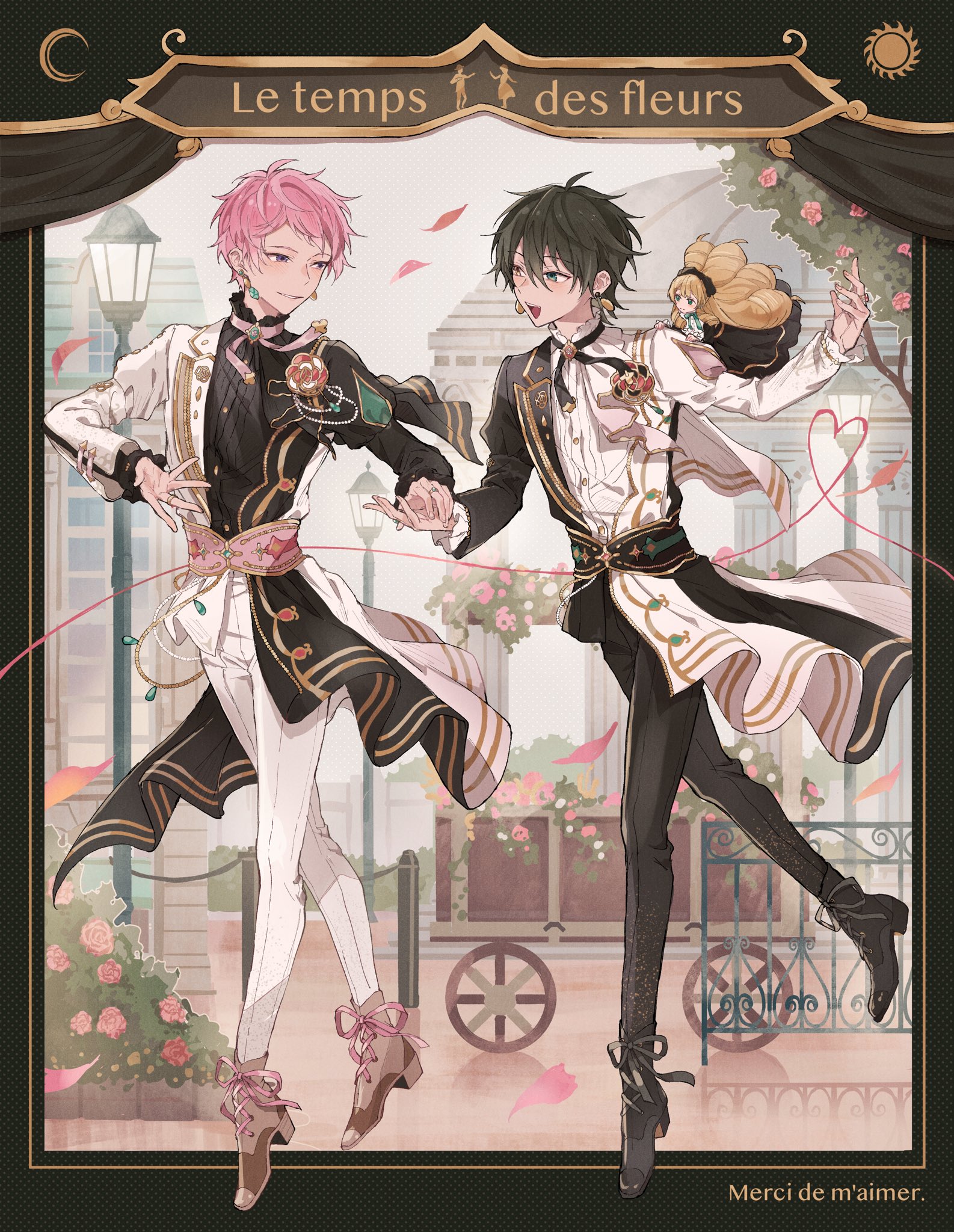 1girl 2boys black_hair blonde_hair blue_eyes doll ensemble_stars! flower full_body heart heart_of_string heterochromia highres itsuki_shu kagehira_mika le_temps_des_fleurs_(ensemble_stars!) long_sleeves mademoiselle_(ensemble_stars!) male_focus multiple_boys official_alternate_costume pink_flower pink_hair pink_rose purple_eyes rose short_bangs short_hair valkyrie_(ensemble_stars!) wednesday_108 yellow_eyes