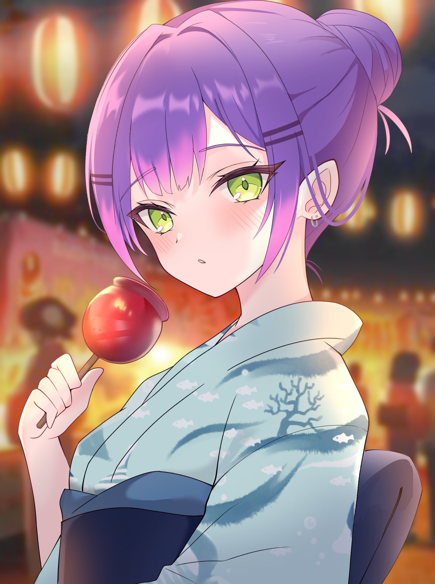 1girl blue_kimono demon_girl ear_piercing fawny gradient_hair green_eyes hair_ornament highres hololive japanese_clothes kimono long_hair medium_hair multicolored_hair open_mouth outdoors piercing pink_hair pointy_ears purple_hair solo tokoyami_towa upper_body virtual_youtuber