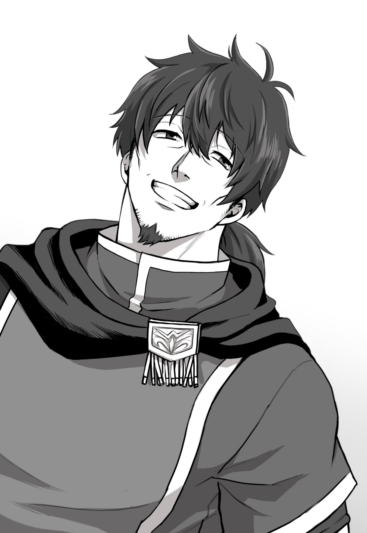 1boy bags_under_eyes cape cheekbones dutch_angle facial_hair fate/grand_order fate_(series) goatee_stubble greyscale grin hair_between_eyes half-closed_eyes haruto_(hit23ewluvnpfo6) hector_(fate) highres long_hair male_focus messy_hair monochrome ponytail sideburns smile solo sparse_stubble stubble upper_body