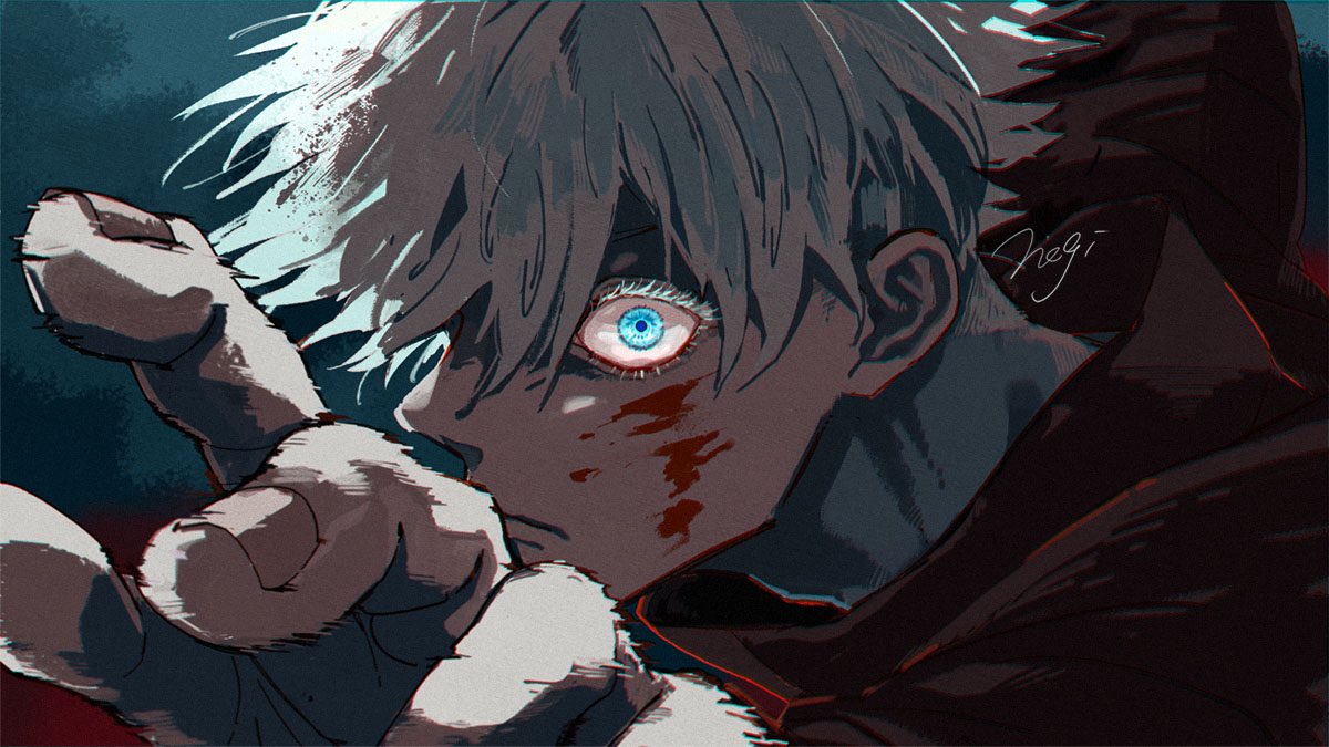 1boy artist_name black_jacket blood blood_on_face blue_background blue_eyes closed_mouth gojo_satoru hand_up jacket jujutsu_kaisen kogashi_negi looking_at_viewer male_focus profile short_hair solo white_hair