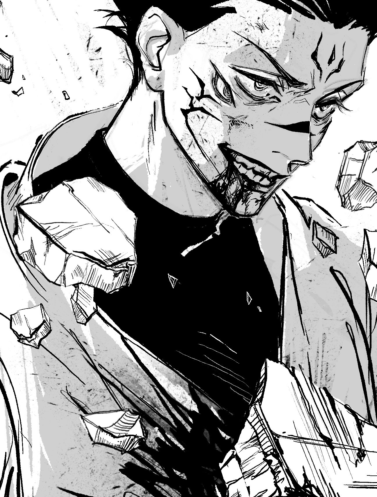 1boy blood blood_from_mouth debris extra_eyes facial_tattoo fushiguro_megumi greyscale grin highres jujutsu_kaisen male_focus monochrome n9c4z open_mouth ryoumen_sukuna_(jujutsu_kaisen) shirt smile solo spoilers tattoo teeth upper_body v-shaped_eyebrows