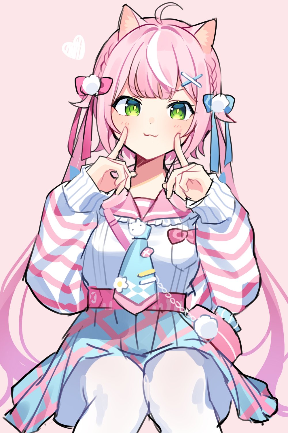 1girl ahoge animal_ears belt blue_necktie blue_skirt bow cat_ears cat_girl fingersmile green_eyes hair_bow hair_ornament highres long_hair long_sleeves multicolored_hair multicolored_skirt necktie nijisanji nijisanji_kr pantyhose pink_belt pink_hair pink_sailor_collar pink_skirt sailor_collar sitting skirt solo streaked_hair twintails very_long_hair virtual_youtuber waka_(wk4444) white_hair white_pantyhose x_hair_ornament yang_nari yang_nari_(3rd_costume)