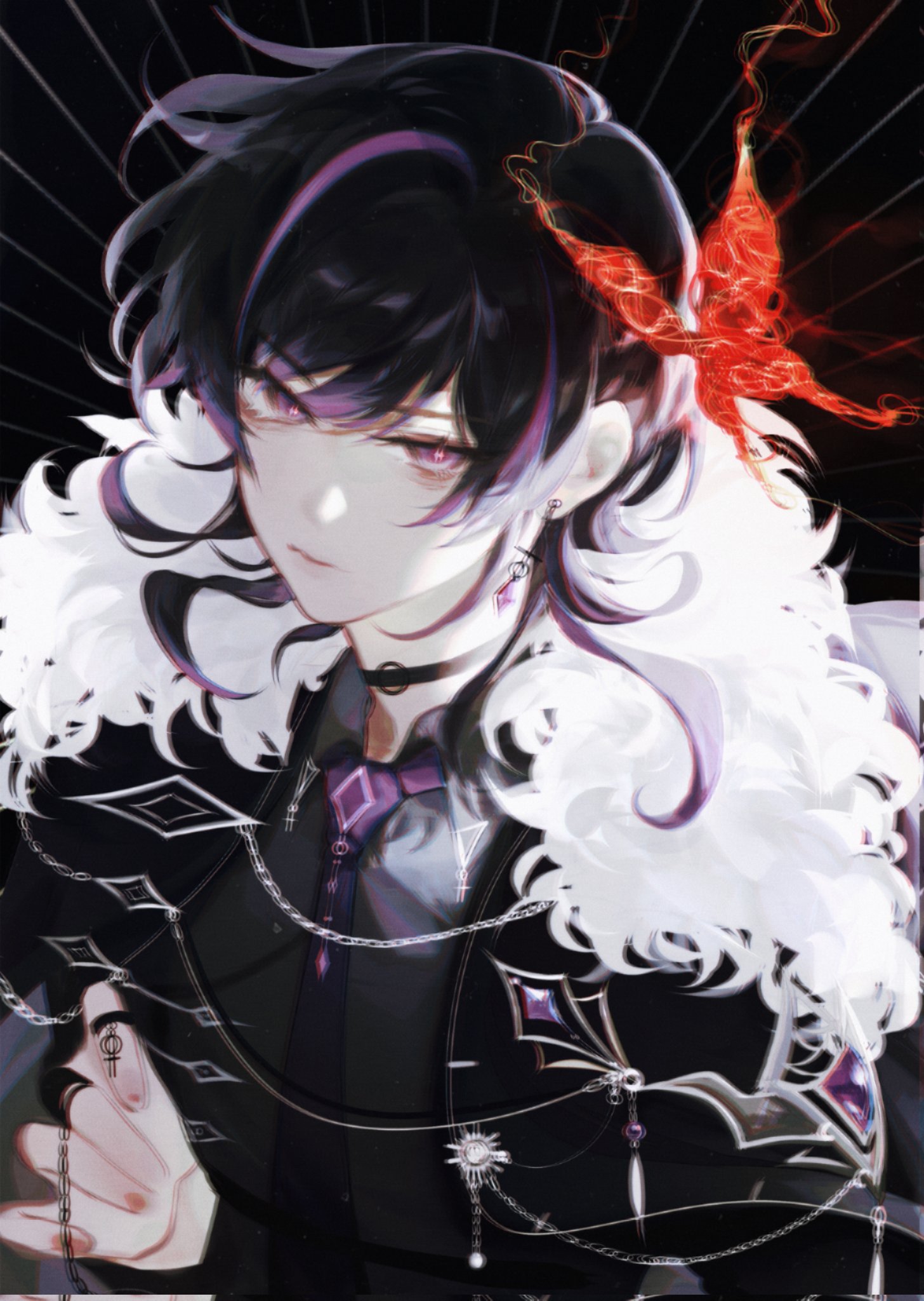 1boy alternate_costume bishounen black_choker blurry bridal_gauntlets bug butterfly chain choker earrings fatui_coat fur-trimmed_jacket fur_trim genshin_impact highres insect jacket jewelry looking_at_viewer male_focus purple_eyes red_butterfly ring scaramouche_(genshin_impact) short_hair single_earring solo upper_body yionyi23