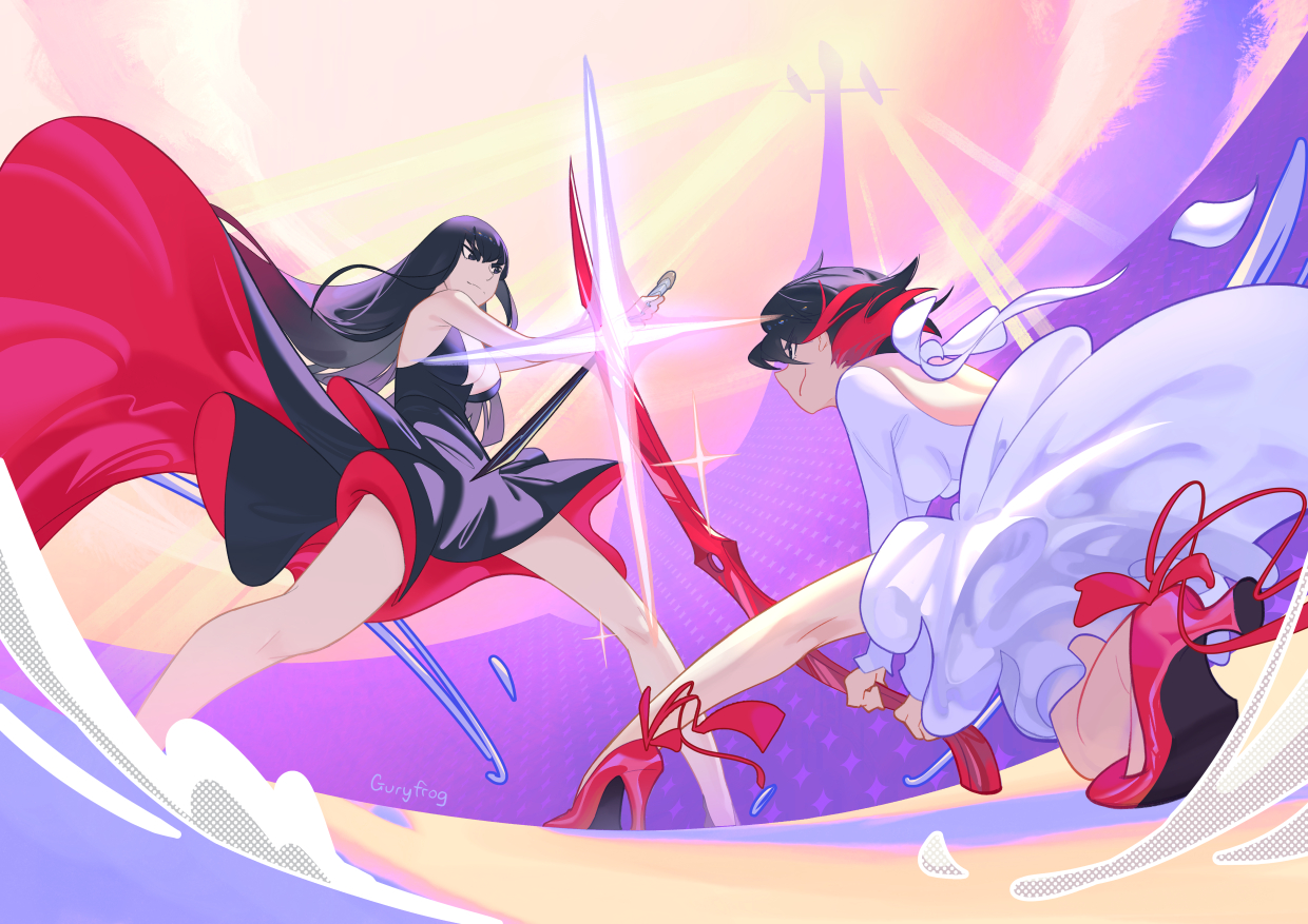 2girls alternate_costume artist_name back backless_dress backless_outfit bakuzan battle black_dress black_hair breasts clash cleavage commentary dress english_commentary fighting_stance full_body guryfrog high_heels holding holding_sword holding_weapon honnouji_gakuen katana kill_la_kill kiryuuin_satsuki kneepits large_breasts lens_flare long_dress long_hair matoi_ryuuko medium_breasts multicolored_hair multiple_girls on_one_knee plunging_neckline red_footwear red_hair reverse_grip scissor_blade_(kill_la_kill) siblings sisters smile sword sword_clash thick_eyebrows two-tone_dress two-tone_hair weapon white_dress wind wind_lift