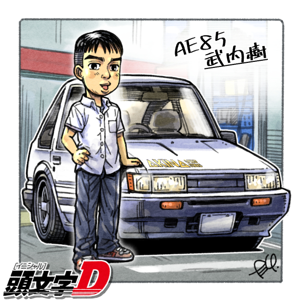 1boy black_eyes black_hair black_pants blush border brown_footwear chibi collared_shirt copyright_name gas_station hand_on_own_hip initial_d logo male_focus open_mouth outside_border pants shadow shirt shoes signature sneakers takedake_(motion_animator) takeuchi_itsuki toyota toyota_sprinter_trueno vehicle_focus white_border white_shirt