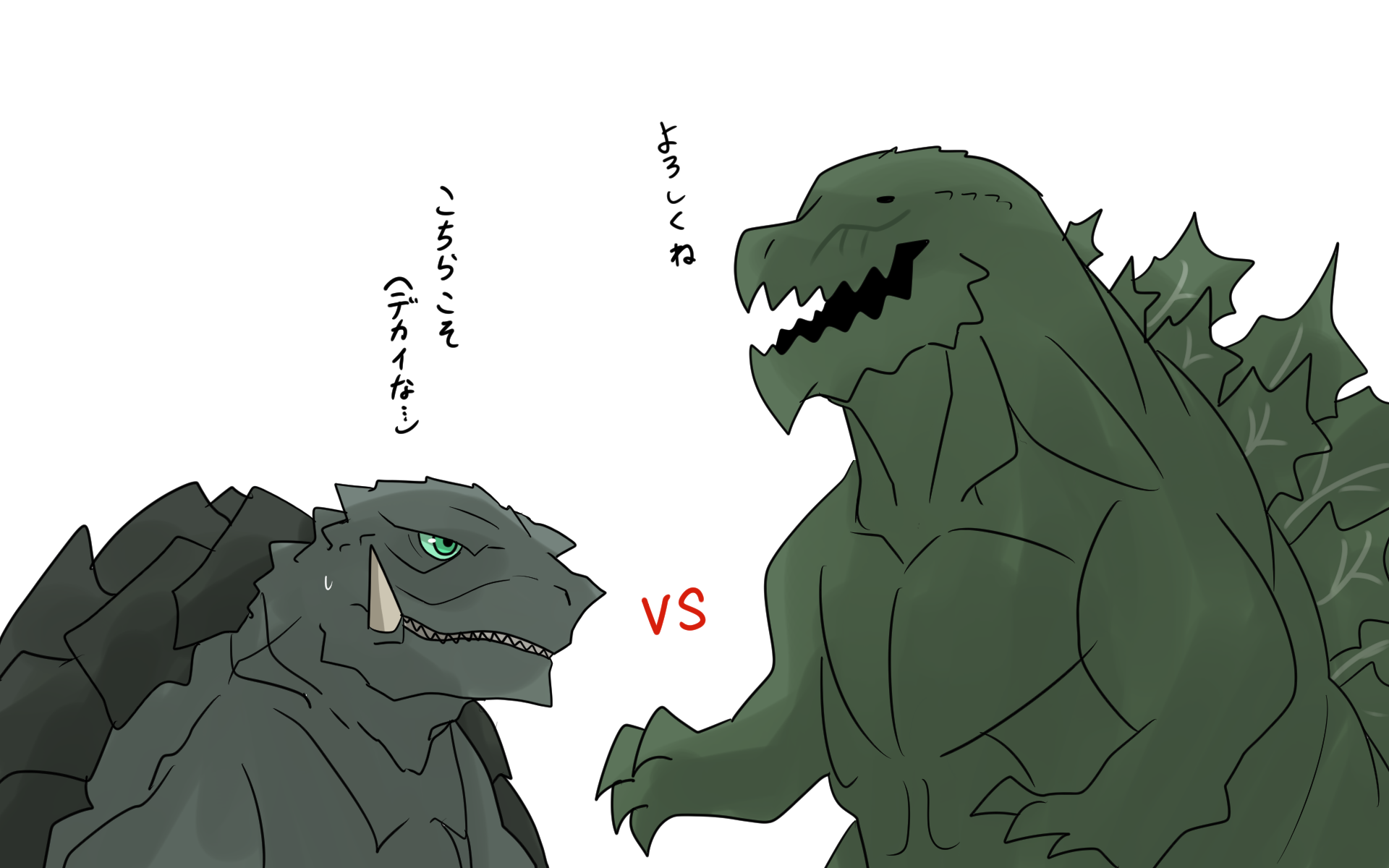 abs black_eyes body_markings claws cracking_knuckles crossover day engi_(animation_studio) gamera gamera_(series) gamera_-rebirth- giant giant_monster glowing glowing_markings glowing_veins godzilla godzilla:_planet_of_the_monsters godzilla_(series) godzilla_battle_line godzilla_earth green_eyes highres ibuki_(tulta_icon) japanese_text kadokawa kaiju monster muscular neon_trim no_humans no_pupils now_production open_mouth polygon_pictures sea_monster sharp_teeth simple_background size_difference spikes sweatdrop teeth toho toho_games translation_request turtle turtle_shell tusks veins white_background