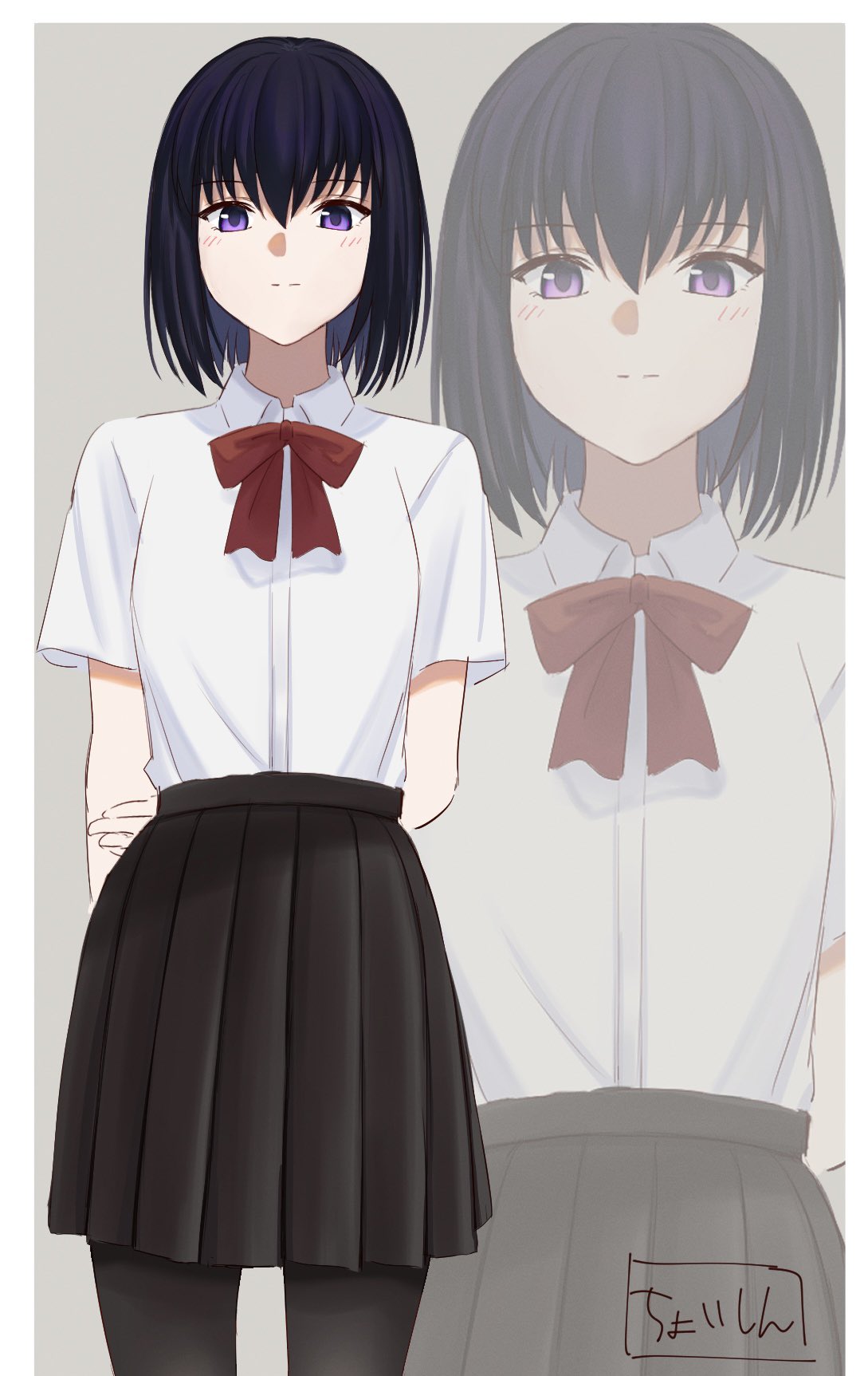 1girl alternate_costume black_hair black_pantyhose blush bow bowtie brown_skirt collared_shirt commentary_request hair_between_eyes highres kuonji_alice looking_at_viewer mahou_tsukai_no_yoru pantyhose pleated_skirt purple_eyes red_bow red_bowtie school_uniform shintyoi2 shirt short_hair short_sleeves skirt solo white_shirt